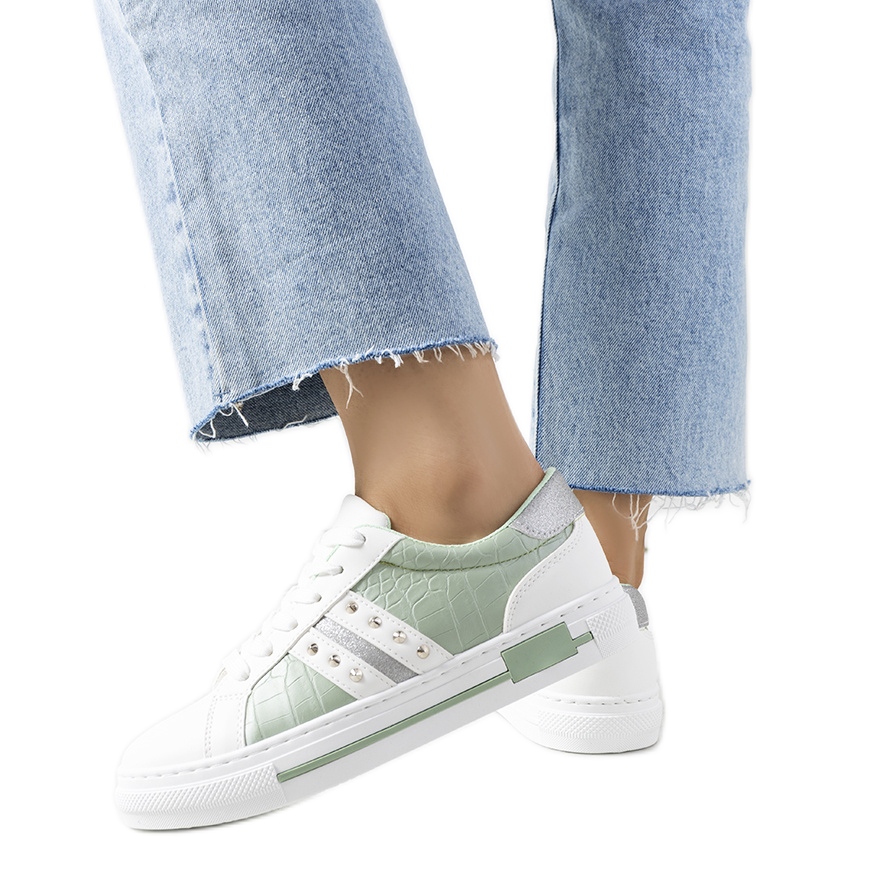Det här är gröna sneakers med Luus-nibbar, som är ett moderiktigt tillskott till vilken outfit som helst! Dessa extremt snygga sneakers kännetecknas av ett unikt krokodilmotiv och iögonfallande accessoarer som nitar och silverglitter som ger dem en unik karaktär.