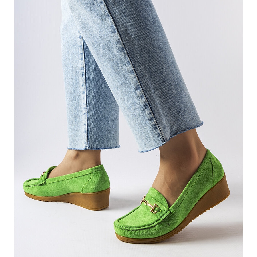 Grön mocka Canis wedge loafers är kvintessensen av elegans och komfort. Dessa snygga skor kännetecknas av en mandeltå, vilket ger dem en subtil karaktär, perfekt matchande modetrender. Tack vare slip-on-designen är det extremt bekvämt att bära dem, vilket gör dem till ett utmärkt val för dagligt bruk.