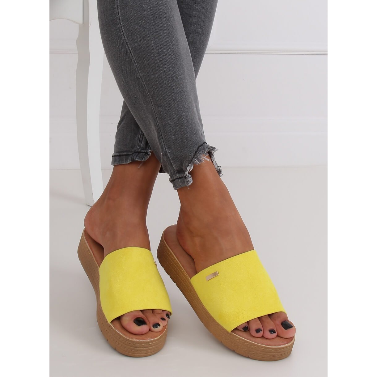 G-576 Gula gula flipflops för kvinnor är det perfekta valet för varma, soliga dagar. Dessa snygga kilmulor med en höjd på 4 cm kombinerar moderiktig design med komfort, vilket gör dem till ett perfekt komplement till vardagens styling.