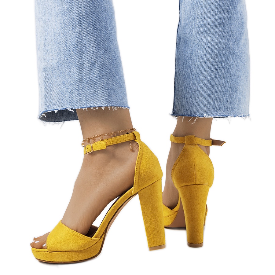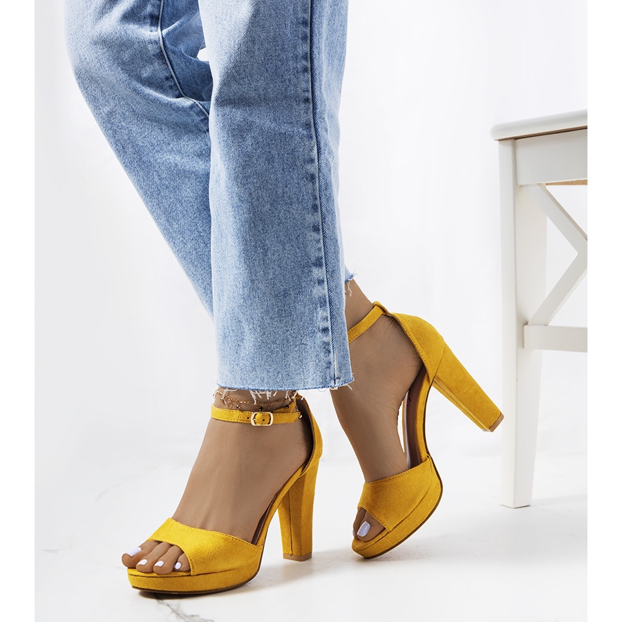 Vi presenterar vackra gula Saldana högklackade sandaler, som kommer att bli en oumbärlig del av din sommargarderob. Deras klassiska snitt kommer perfekt att betona den kvinnliga figuren, och den höga hälen kommer att lägga till elegans och självförtroende till varje styling.