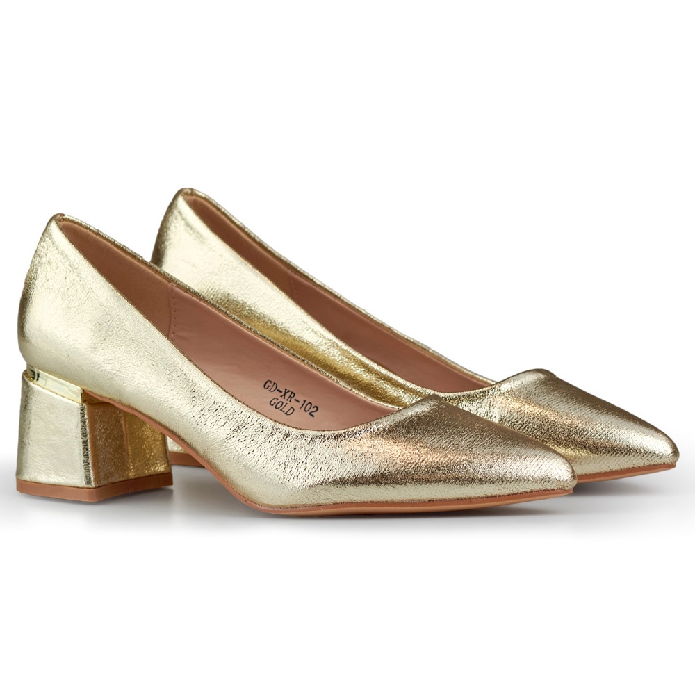 Detaljer: Guld lågklackade pumps, eleganta damskor i guld gyllene
