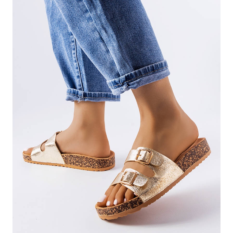 Vi presenterar guld Cincinna guld flipflops med korksula - det perfekta valet för den kommande sommaren! Dessa fashionabla plattformsflipflops utmärker sig inte bara för sitt snygga utseende, utan också för sin exceptionella bärkomfort. Tillverkade av högkvalitativt ekologiskt mockaskinn, med dekorativa spännen, ger de elegans till varje vardagsstyling.