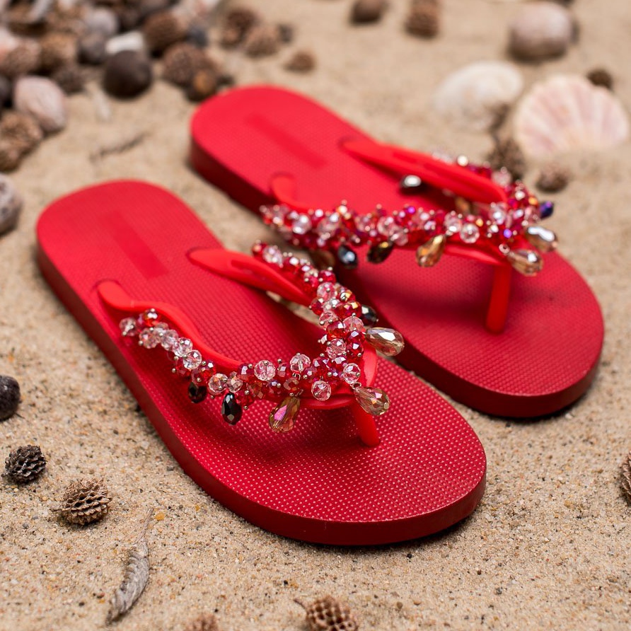 Upptäck extraordinär stil och komfort med röda SHELOVET gummiflipflops med dekorationer! Dessa unika flipflops är det perfekta valet för de kommande sommardagarna och kommer att glädja varje kvinna. Tack vare rika dekorationer, inklusive gnistrande kristaller, är de ett perfekt komplement till alla sommarstylingar.
