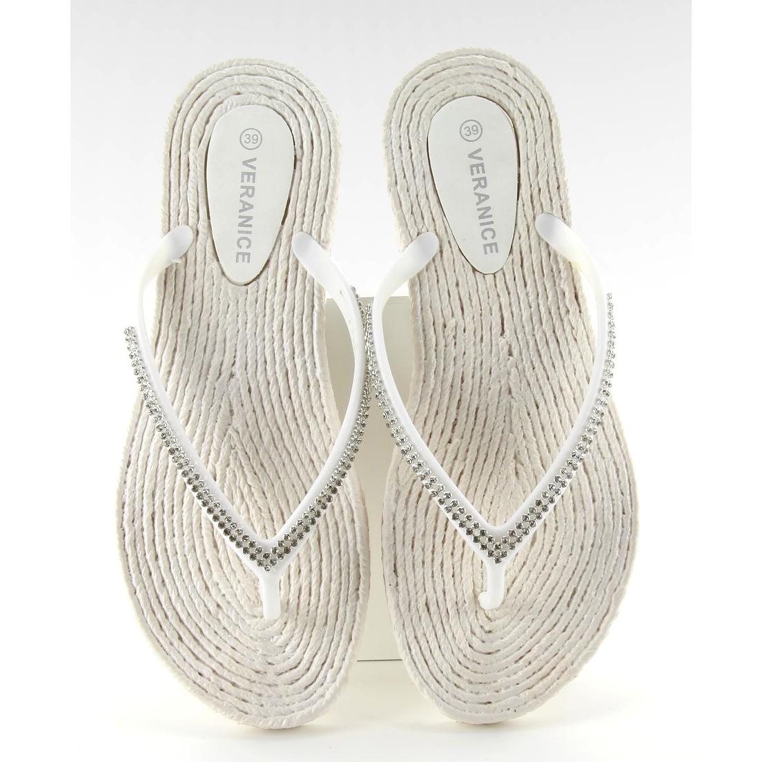 Sulan med espadrillemönster utstrålar bohemisk charm, som liknar en elegant halmväv som ger karaktär till flipflopsna. Remmar dekorerade med cubic zirconia ger en delikat lyster, vilket gör dessa flipflops inte bara praktiska utan också imponerande.