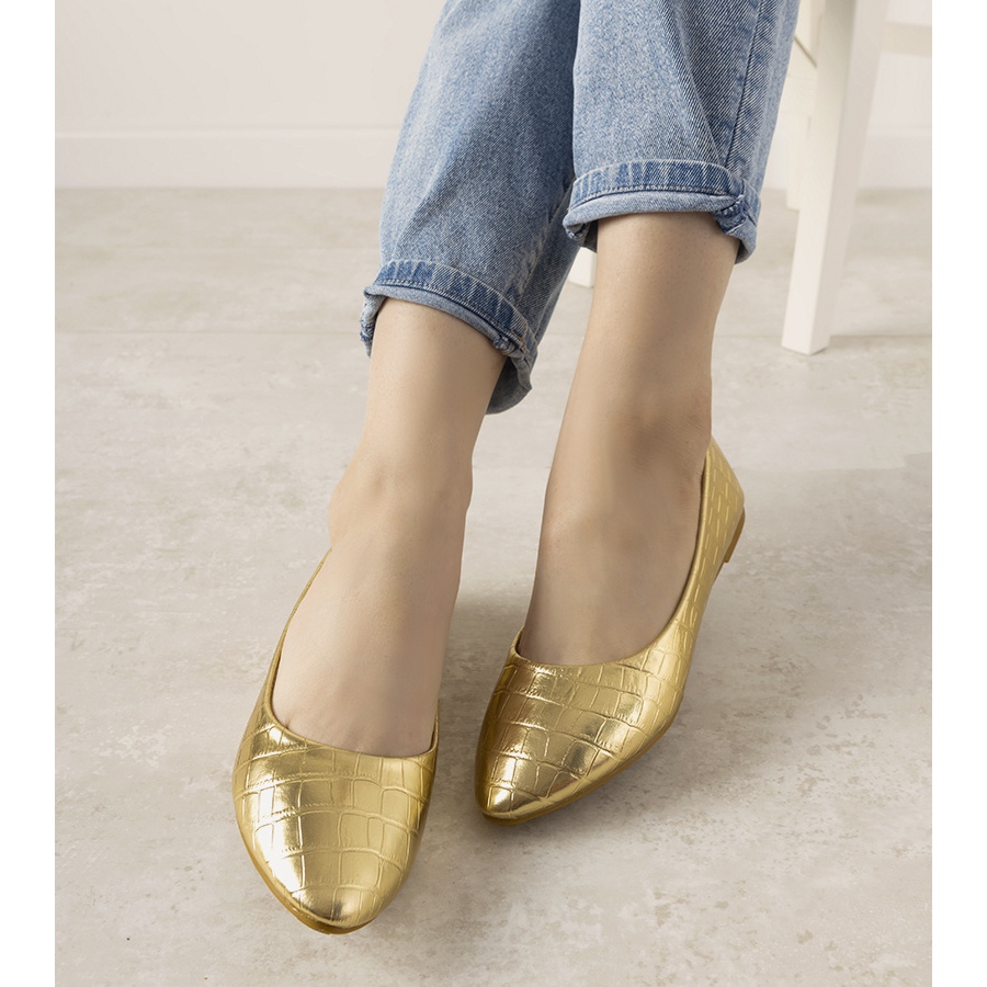 Camilia ballerinaskor i guld med krokodilskinnsmotiv är ett elegant förslag för varje kvinna som vill ge lite glans till sin styling. Tillverkade av högkvalitativt ekologiskt läder, dessa balettlägenheter gläds inte bara med sitt utseende, utan också med komforten att bära.