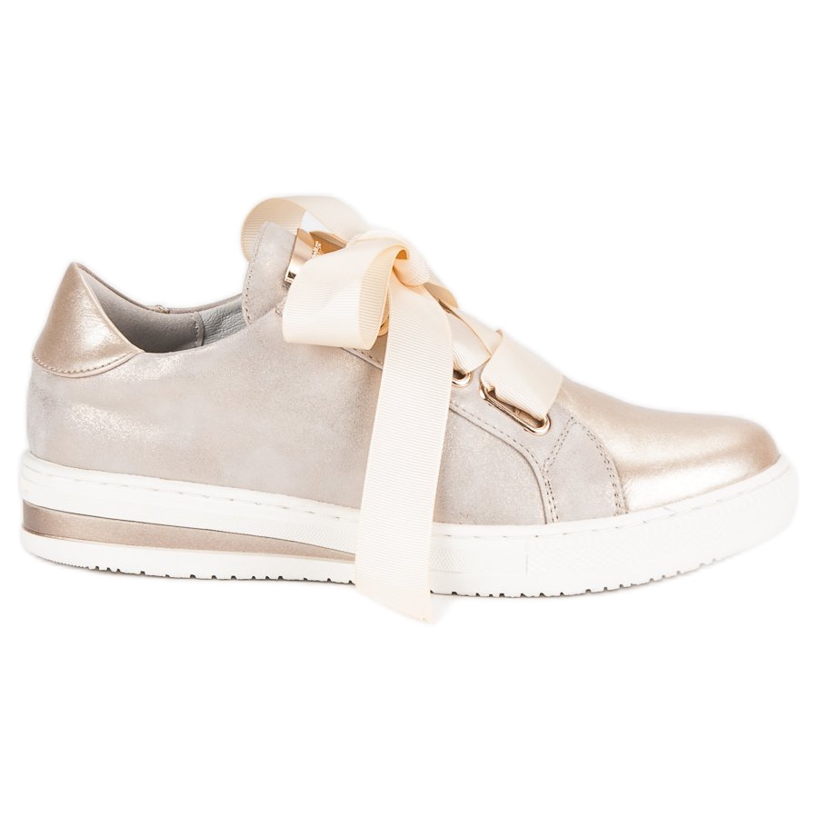 Skorna är gjorda av högkvalitativt ekologiskt läder och njuter av sin delikata gyllene färg, som tillför glans och sticker ut i mängden. Breda beige band fungerar som spetsar och skapar en ovanlig men mycket elegant detalj. Dessutom är deras hälräknare förstyvad, vilket ger utmärkt stöd för foten, och den runda tån understryker skornas klassiska karaktär.