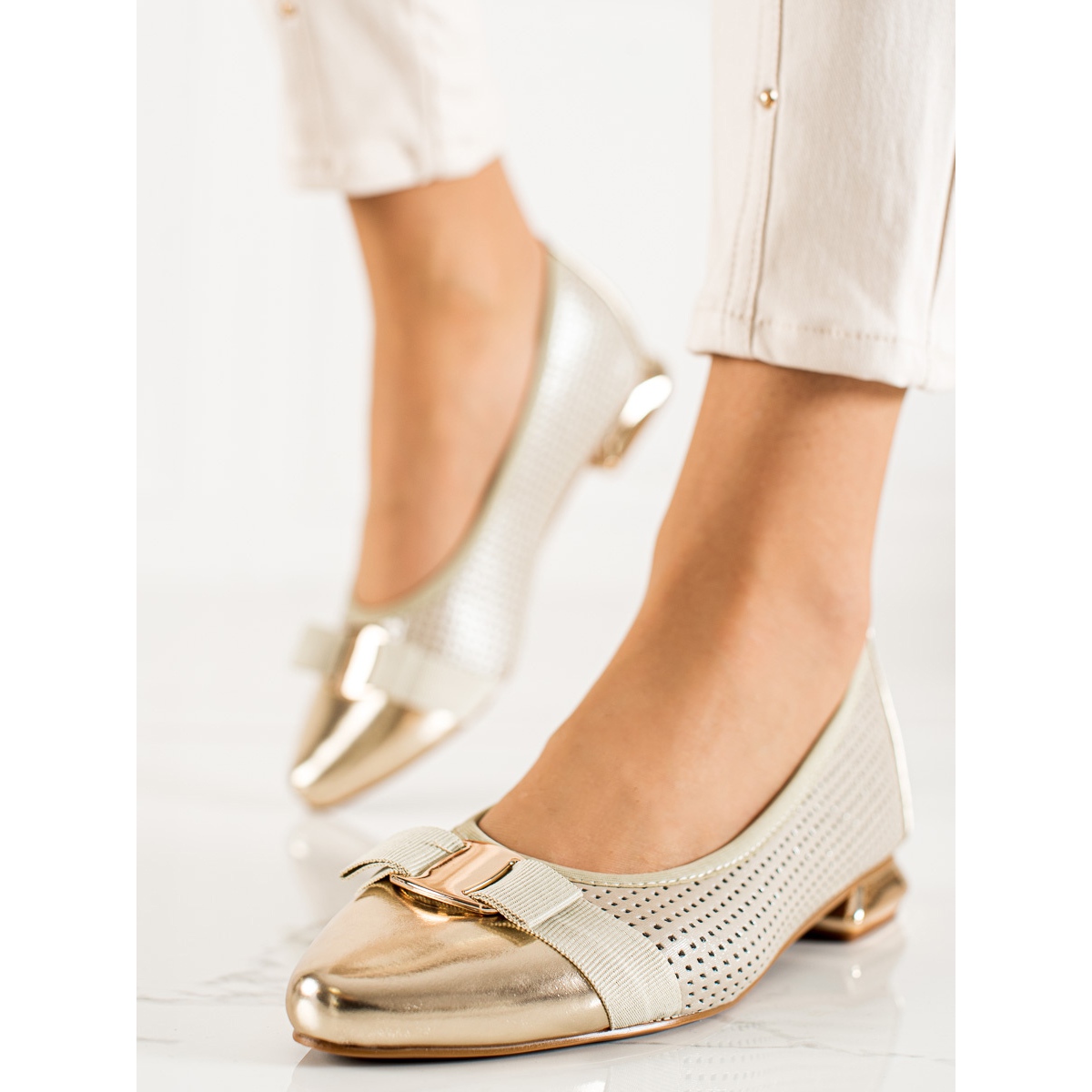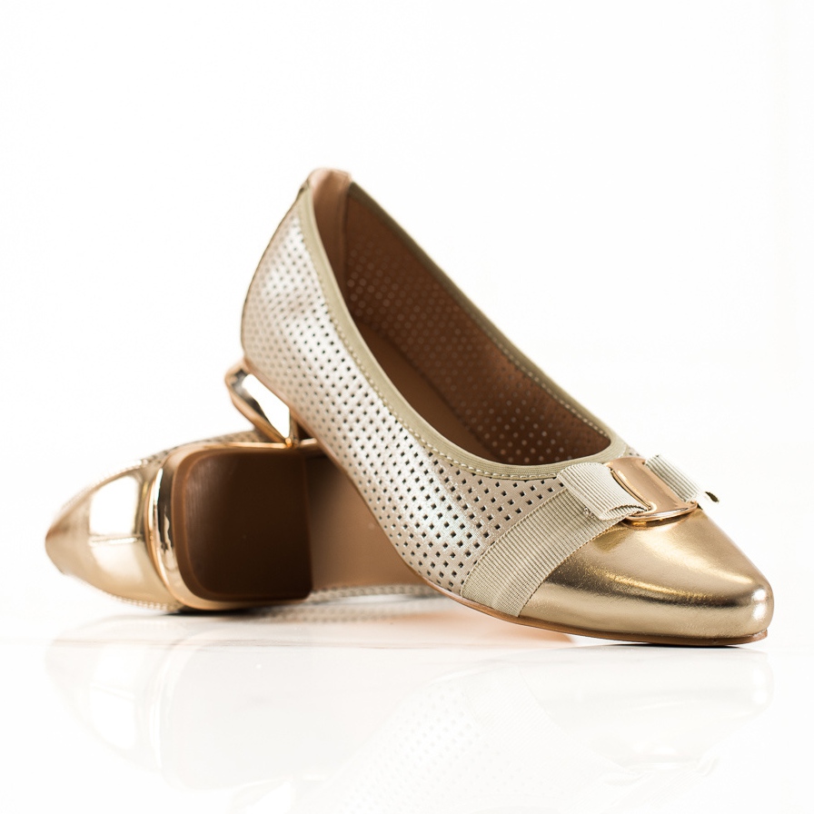 Pumparna har en subtilt dekorerad ovandel av konstläder, bestående av 50 % textilmaterial, vilket ger en modern karaktär. Den runda tån och den platta hälen på 2,5 cm gör dem inte bara snygga, utan också bekväma för långtidsbruk. En ytterligare diversifiering är det genombrutna mönstret och en elegant båge, som lockar uppmärksamhet och ger skorna en unik karaktär.
