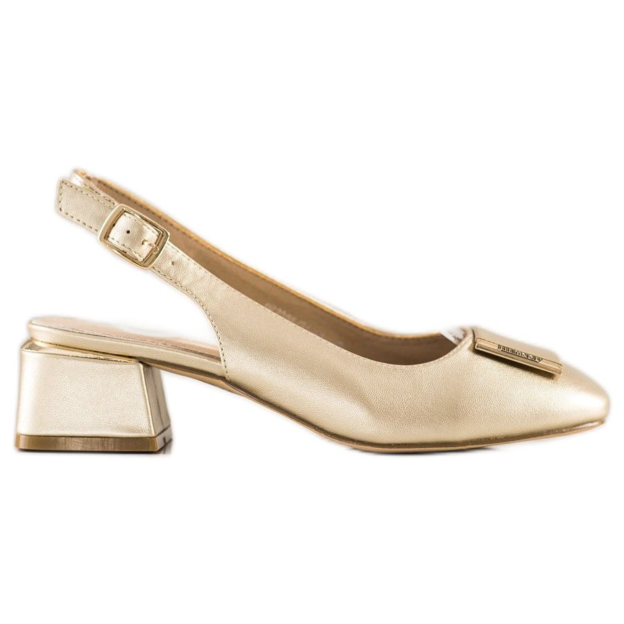 Filippo pumps passar perfekt in i vårens och sommarens trender. Deras gyllene färg drar till sig uppmärksamhet och kommer säkert att få dig att sticka ut i alla företag. Tack vare den syntetiska sulan kan du njuta av komfort under långa timmar på dina fötter.
