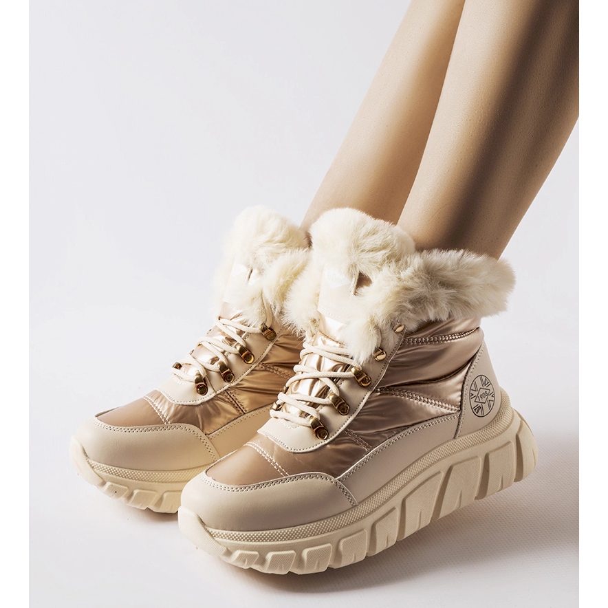 Den höga plattformen, 4 cm hög, gör att du kan isolera dina fötter från den kalla ytan och ger samtidigt skorna en originell karaktär. Höjden på själva snökängorna är 17 cm, vilket ger ett utmärkt skydd mot kylan. Utan mönster, men med en unik gyllene färg, blir skorna ett perfekt stöd i den grå vintern.