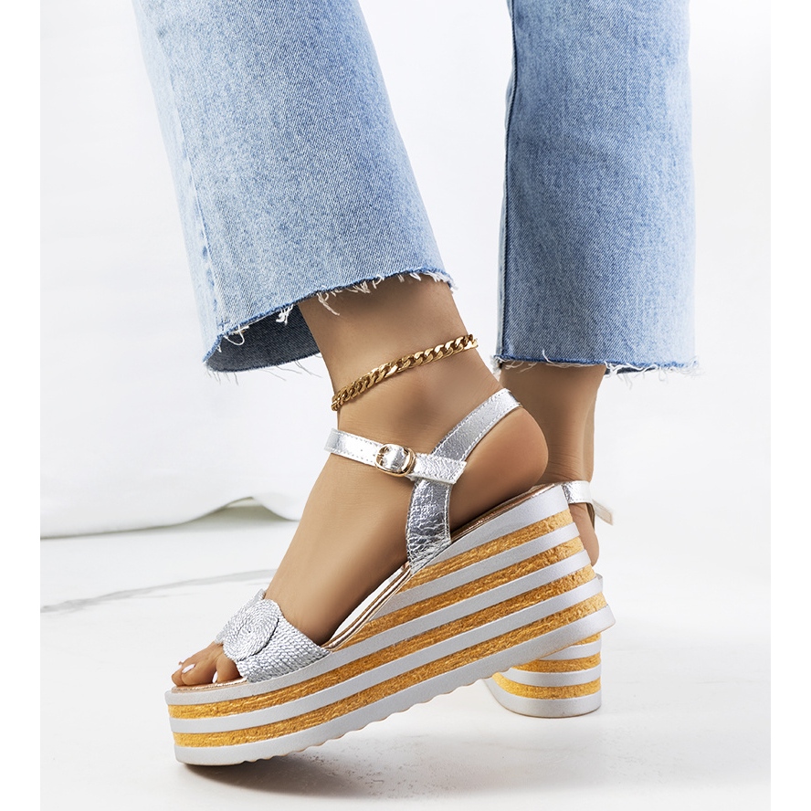 Hanan kilasandaler i silver är det perfekta valet för sommardagar och kommer att ge glans till alla stylingar. De kännetecknas av en hög plattform och kil, vilket gör dem inte bara eleganta, utan också extremt bekväma. Den metalliska silverfärgen på ovandelen framhäver benen vackert, vilket gör dem optiskt smalare.