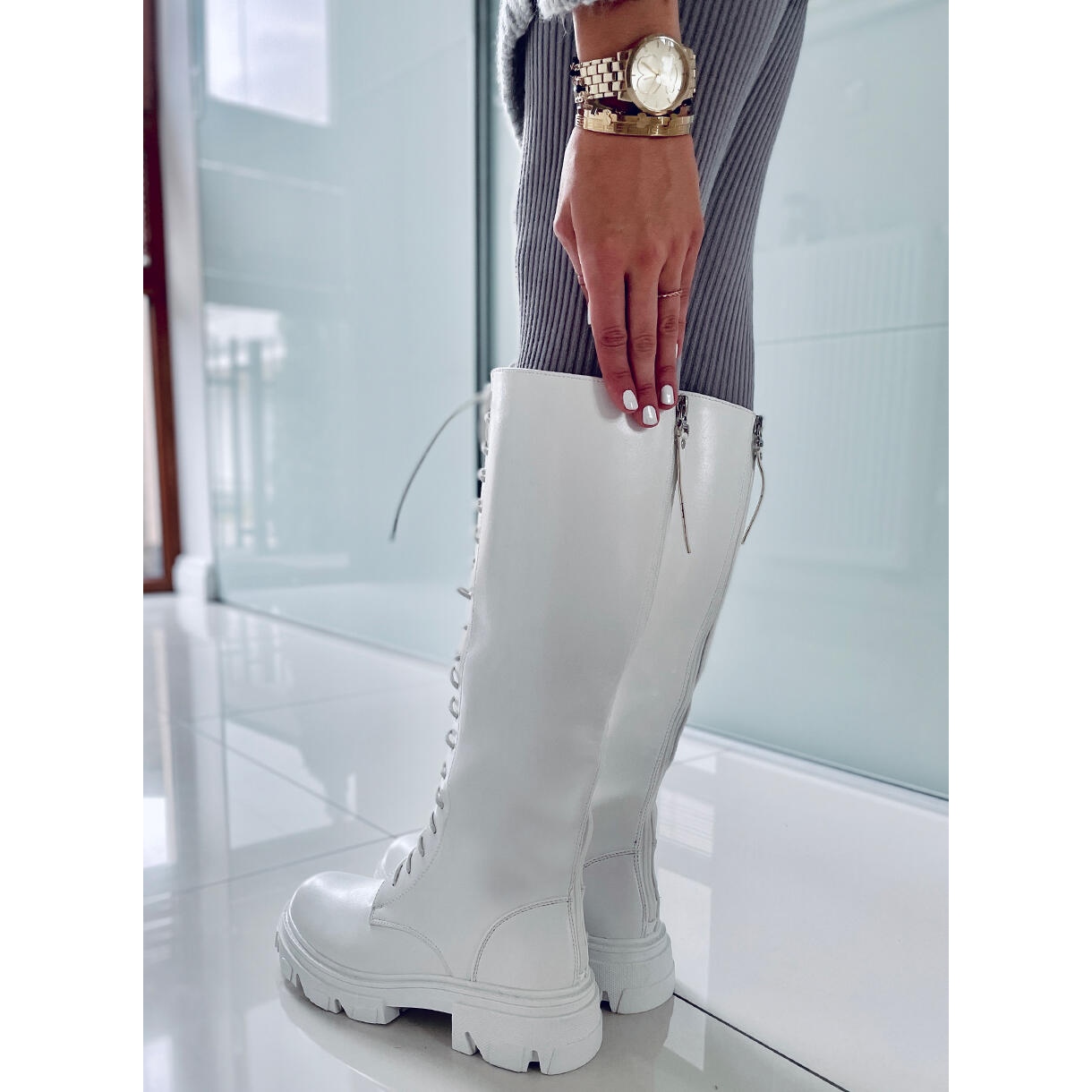 **BM Hanson White damstövlar** är ett idealiskt val för kvinnor som värdesätter stil och komfort. Dessa snörstövlar med klassisk stövelstil designades med vardagsbruk och modetrender i åtanke. Den tjocka, syntetiska sulan säkerställer stabilitet och bärkomfort, medan den platta hälen gör skorna extremt funktionella, perfekta för både vardagsbruk och mer militär styling.