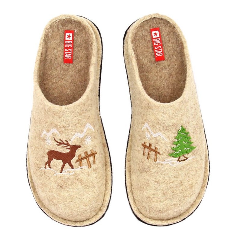 Bekväma, eleganta hemtofflor Big Star Int1803A i en universell beige färg - perfekt för svalare morgnar och kvällar hemma. Tillverkad av mjuk filt i kombination med en syntetisk överdel ger de en trevlig känsla av mjukhet och god kontakt med marken. Den klassiska, lågklippta med en rund tå och julbroderi ger dem charm till dem, och den diskreta tillverkarens logotyp betonar kvaliteten på finishen.