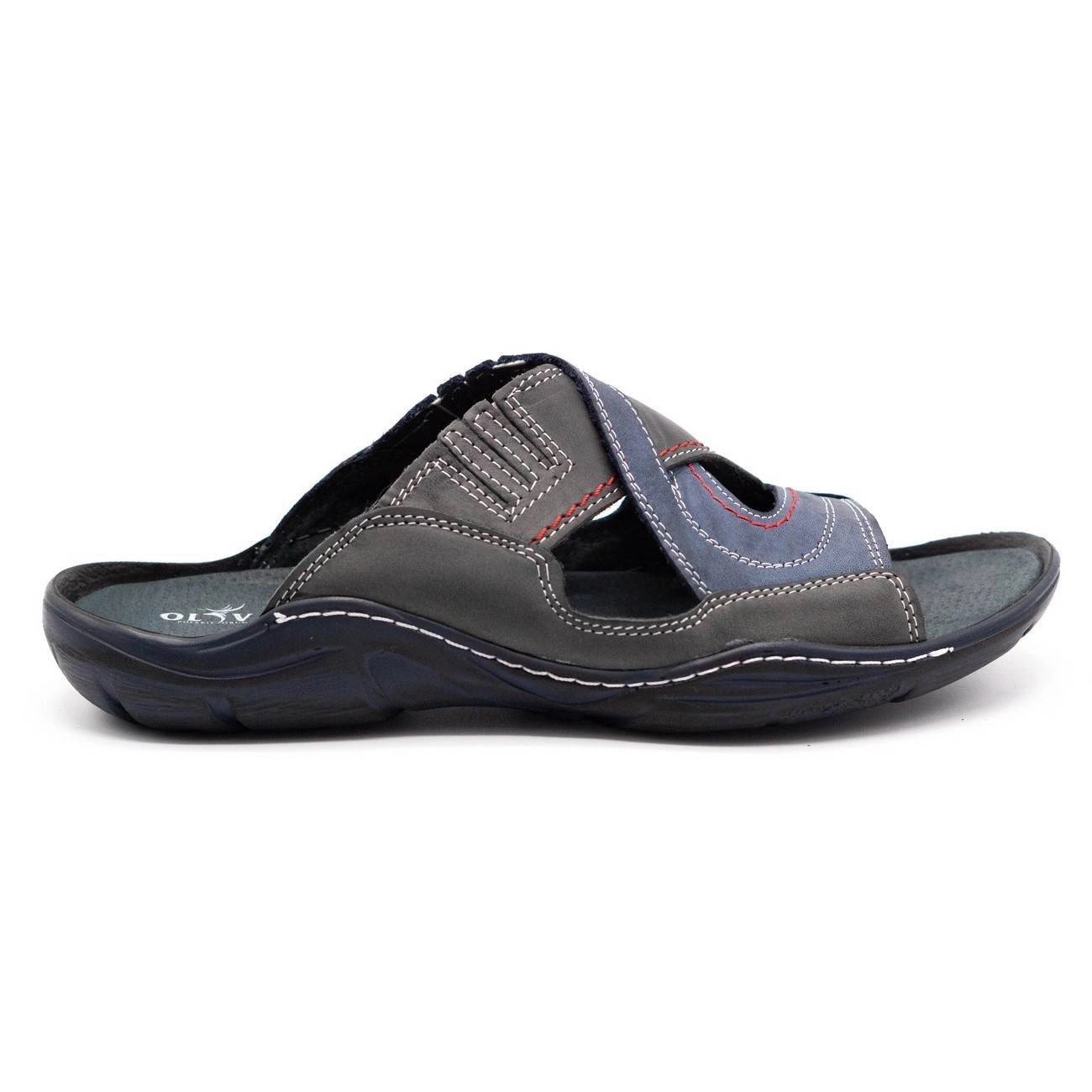 Sport, universella mäns flip flops som kommer att fungera både på semester och lika bekväma hem- eller helgskor. Allt gjord av naturligt läder - ett mjukt och trevligt till beröringsytan ger intrycket av att gå barfota och samtidigt isolerar effektivt från marken. Den profilerade insatsen av naturläder stöder fotbrunnen och säkerställer komfort även med längre användning. Den lätta designen och en neutral, marinblå färg underlättar matchningen till många stilar, och sydd-glued design garanterar hållbarhet. Polsk tillverkares produkt - kvalitetssäkerhet.
