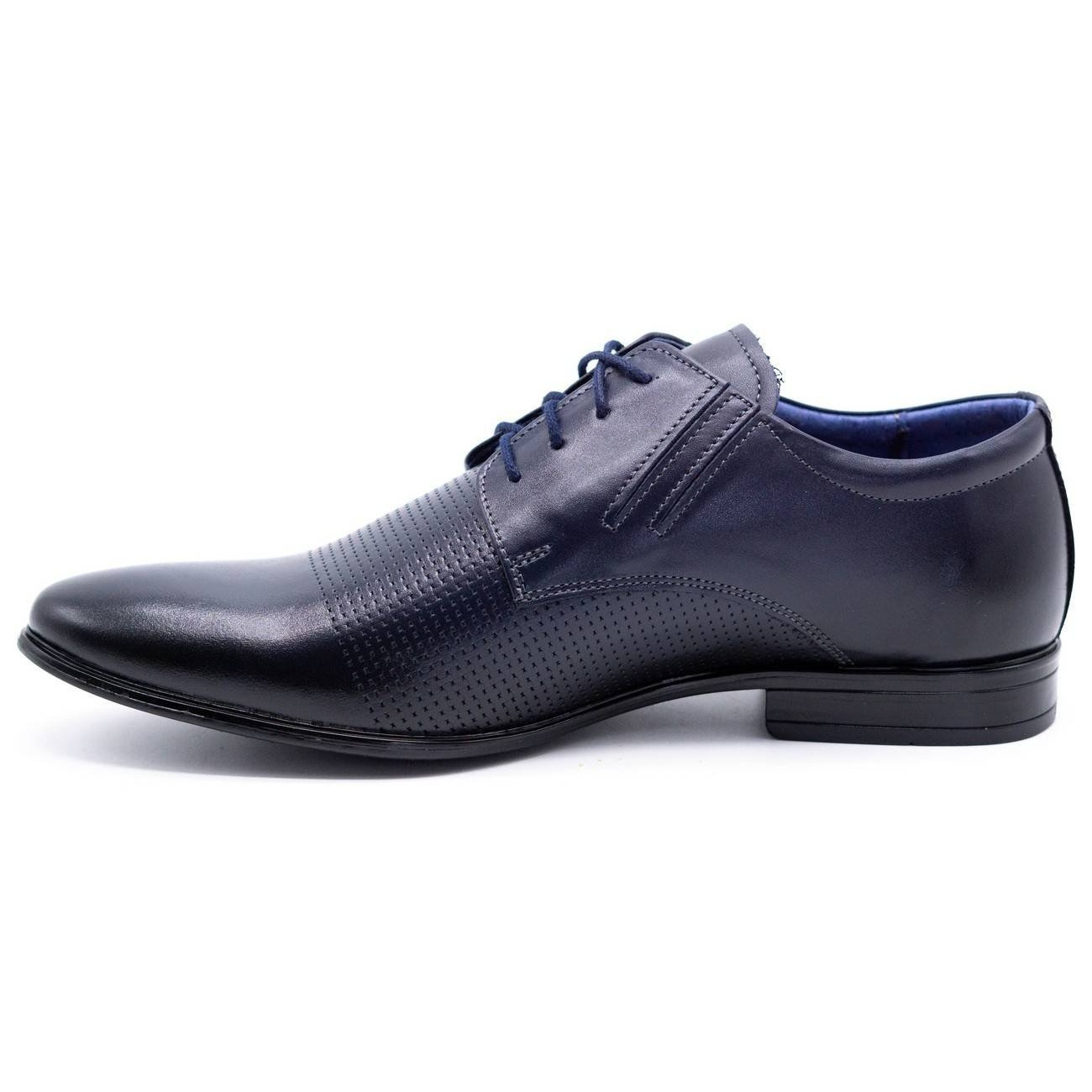 Den universella marinblå färgen gör att modellen blandas väl med kostymen för officiella tillfällen, men den kommer väl att komplettera mindre formella uppsättningar, t.ex. med jeans. Den klassiska, runda näsan och snörda låset betonar skorens eleganta natur, och en liten häl med en höjd av 2,5 cm förbättrar figuren och komforten att gå.