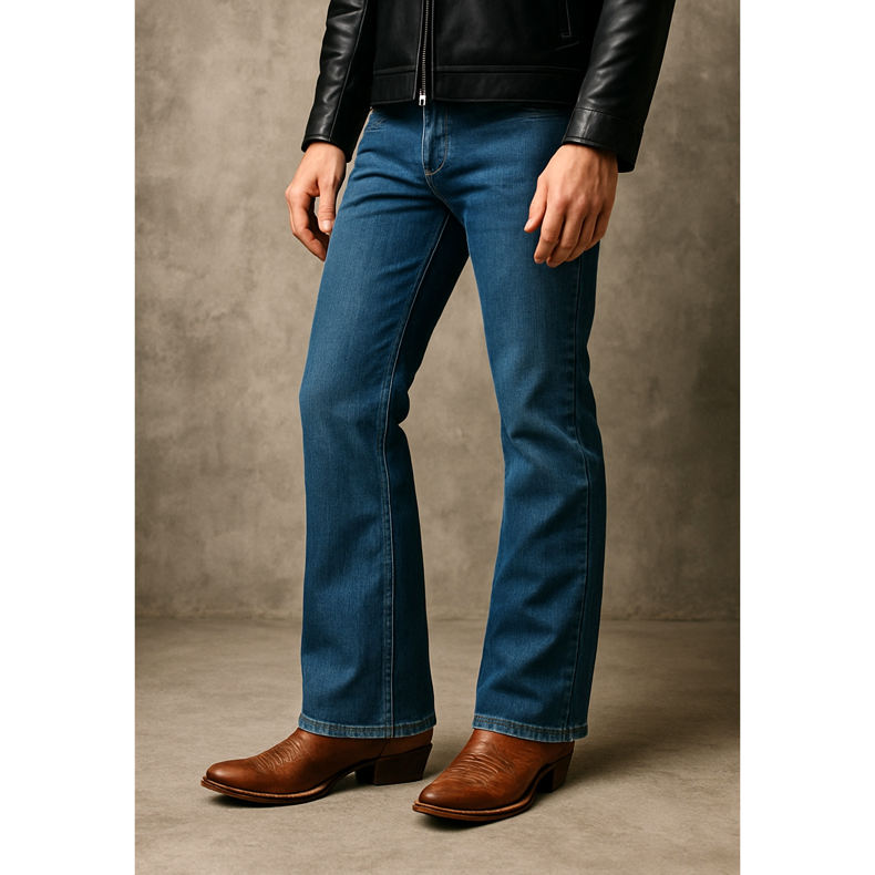 Bootcut och flare jeans kännetecknas av en förlängning från knäet och ner, skapad speciellt för höga skor. De bästa passformerna är: cowboystövlar (westernstövlar), Chelseastövlar, jodhpurstövlar, arbetarstövlar, höga snörstövlar. Benen ska täcka överdelen, falla något över skon. Undvik låga sneakers - de kommer att se vilse ut under byxor med vida ben. Mörka bootcut-jeans med svarta Chelsea-stövlar och en skinnjacka är en rockig look. Ljusa utslag med bruna cowboystövlar ger stylingen en boho-country vibe. Detta snitt av jeans har kommit tillbaka till fördel inom modernt herrmode.