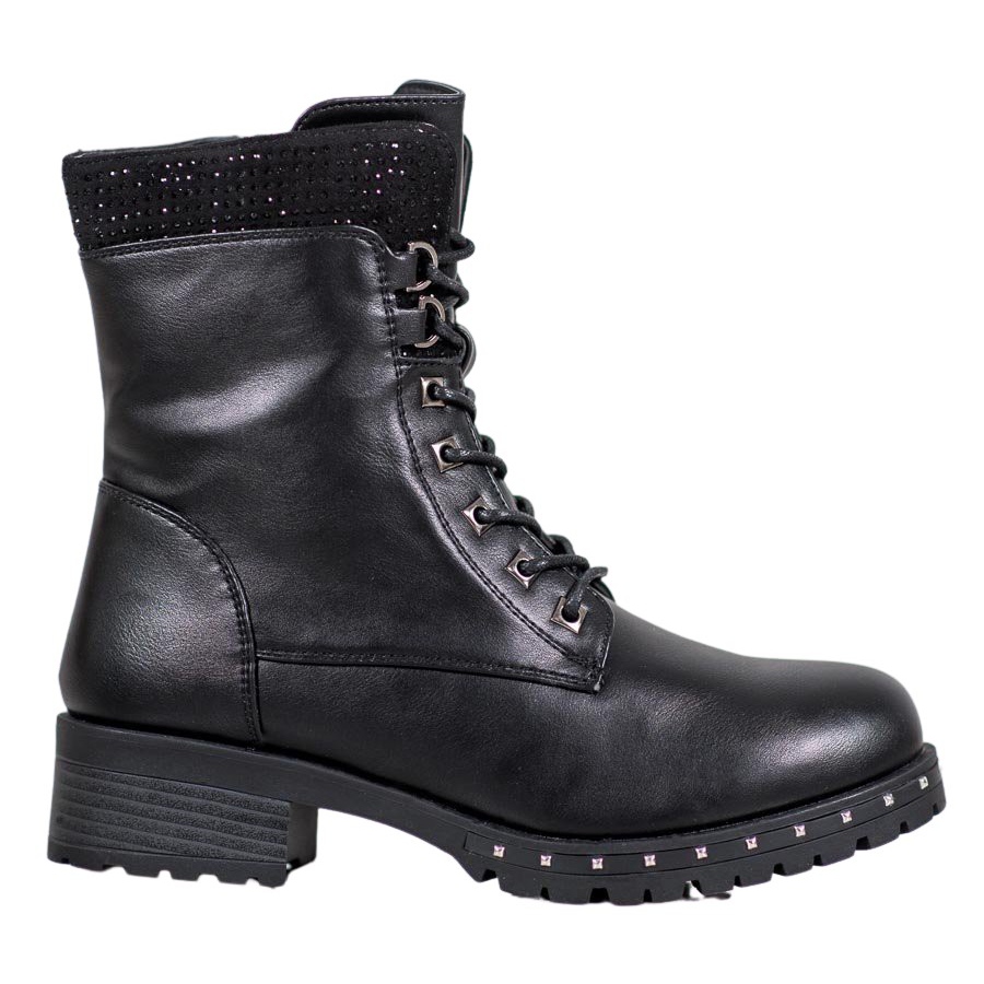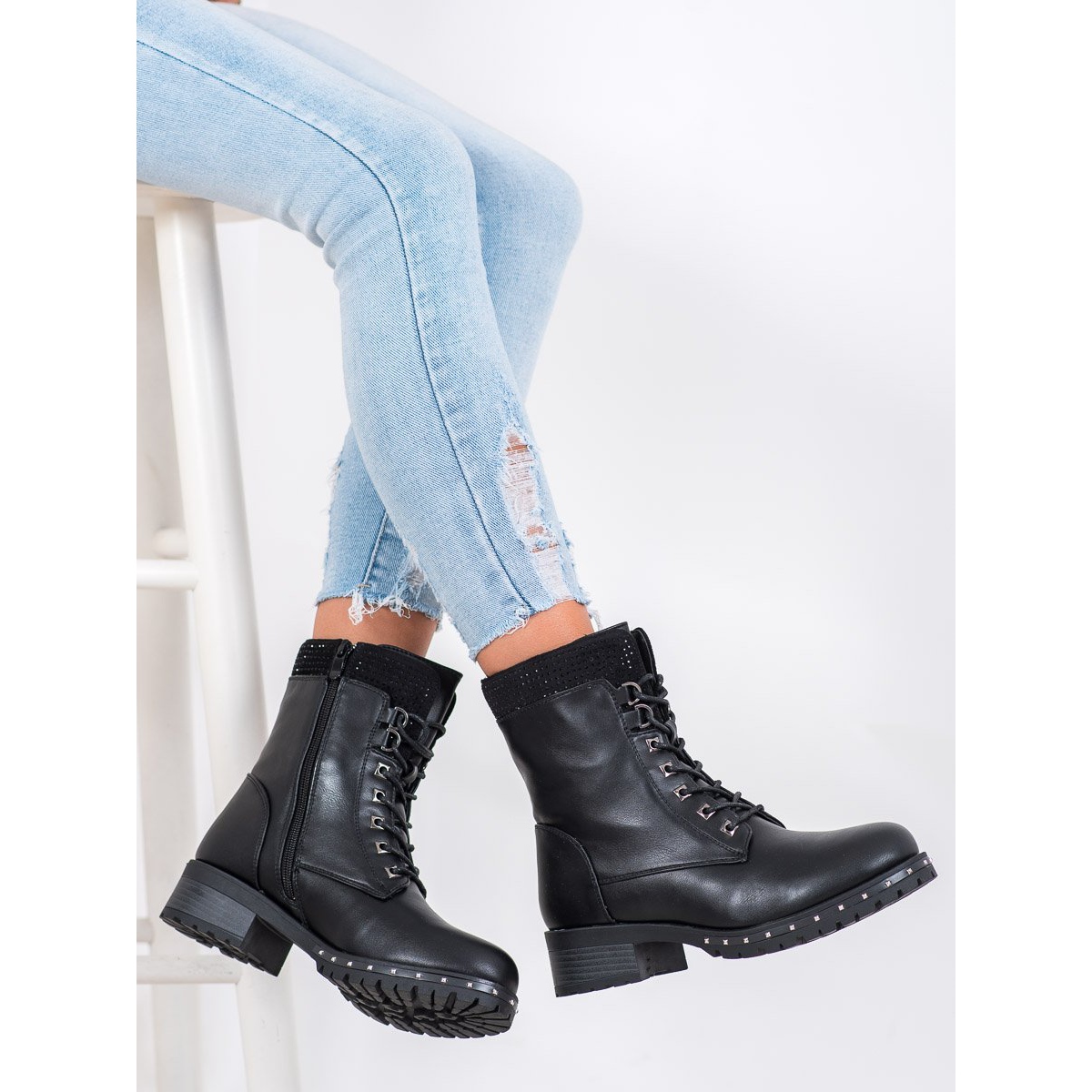 Den 16 cm höga ovandelen skyddar effektivt mot ogynnsamma väderförhållanden, och den runda tån ger subtilitet. En hög och platt syntetisk sula, 2 cm tjock, säkerställer stabilitet och komfort vid varje steg. Dessutom är strass och dubbar på toppen en snygg accent som ger skorna en rockig karaktär.