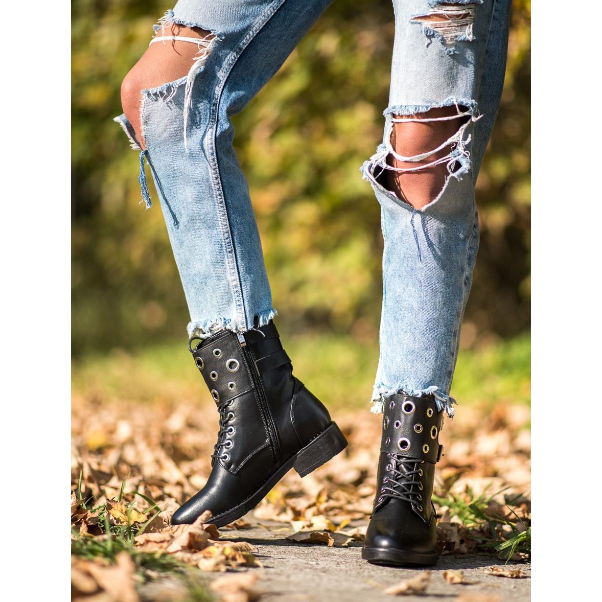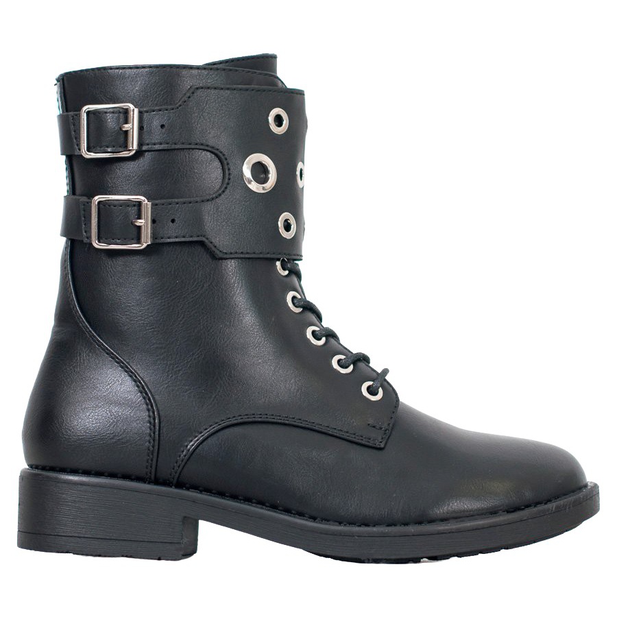 Höga överdelar, som når över ankeln, skyddar effektivt dina fötter mot kyla och fukt, vilket gör dem till ett utmärkt val för kallare dagar. En solid sula med slitbana garanterar stabilitet och komfort under gång. En ytterligare fördel är strass och dekorativa spännen som ger skorna en rockig karaktär och gör dem till ett mode-must-have i varje garderob.