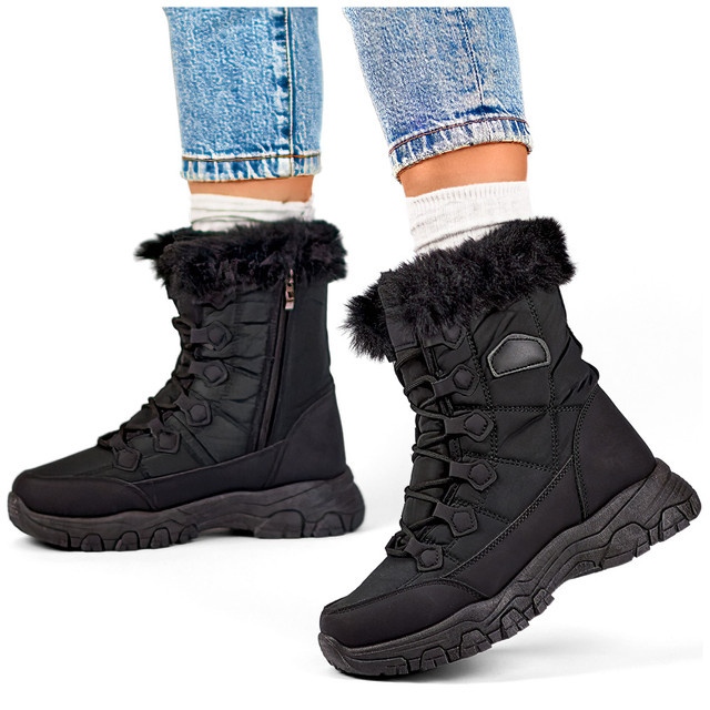 Höjden på den övre delen av 17 cm och standardsting garanteras av perfekt passform för varje ben, och Eco -pälsen inuti skorna ger ytterligare värme och bär komfort. Tack vare en platt plattform 4 cm hög och en solid sula kommer du att upprätthålla stabilitet i svår terräng. Svart, minimalistisk design är en del av nuvarande trender, så du kan enkelt matcha dem med olika vinterstyliseringar.