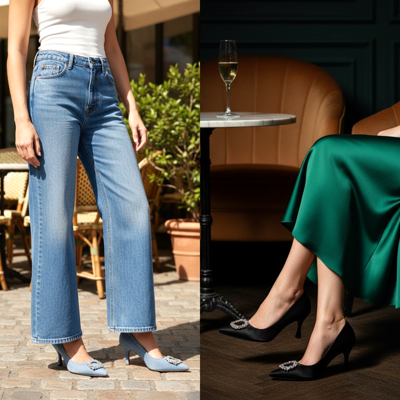 För vardagsbruk, prova att kombinera kattungeklackar med bredbenta jeans i palazzostil och en delikat topp. Denna outfit är extremt på modet 2026 - kontrasten mellan lättheten hos vida byxor och elegansen hos kattungars klackar ger en sofistikerad effekt.