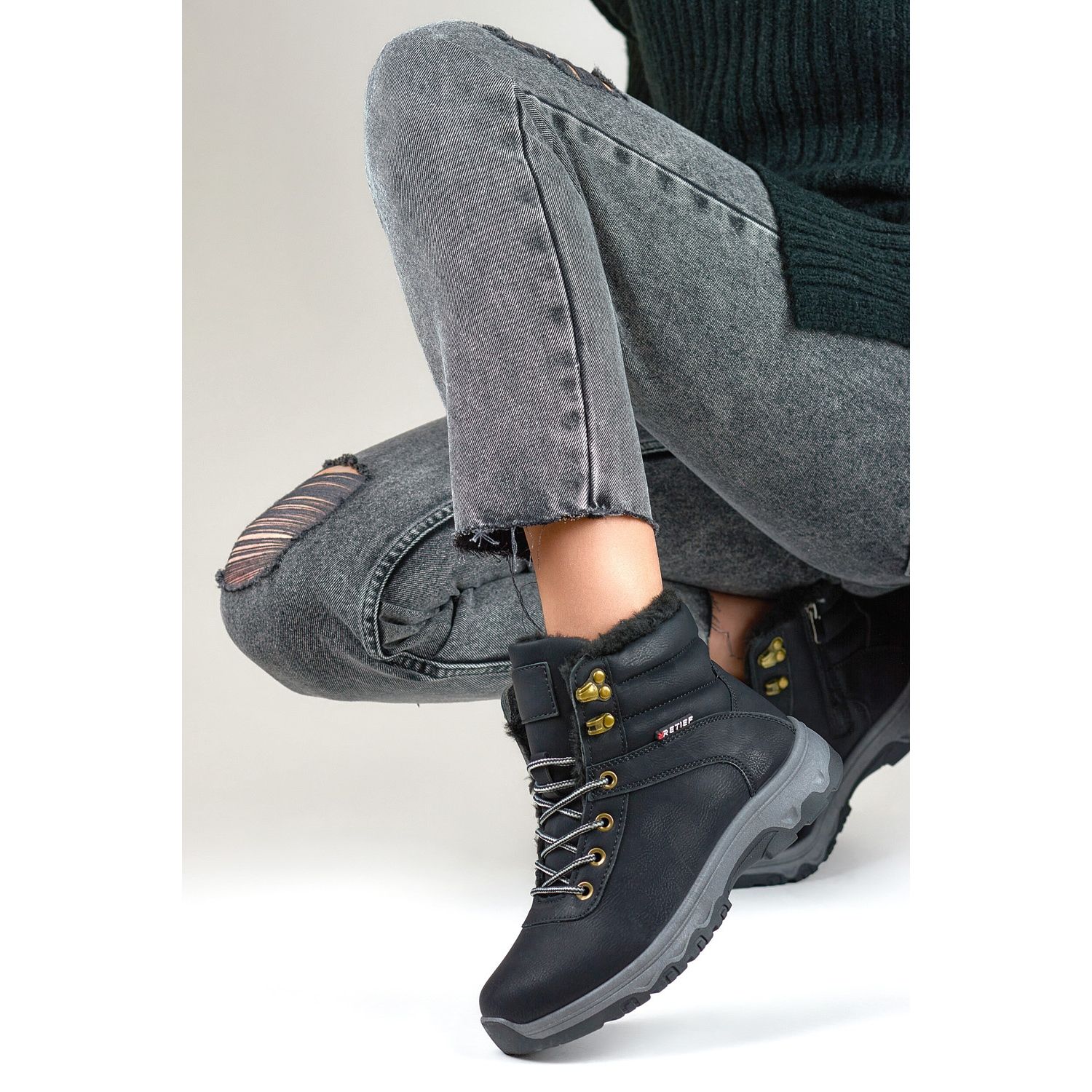Höga kvinnors vandringsskor - Svart, praktiskt och snyggt. Massivt ekologiskt läder, isolerat interiör och en bekväm plattform gör det till det perfekta valet för svalare dagar - både för bergsvandring och för vardagligt, stadsbruk.