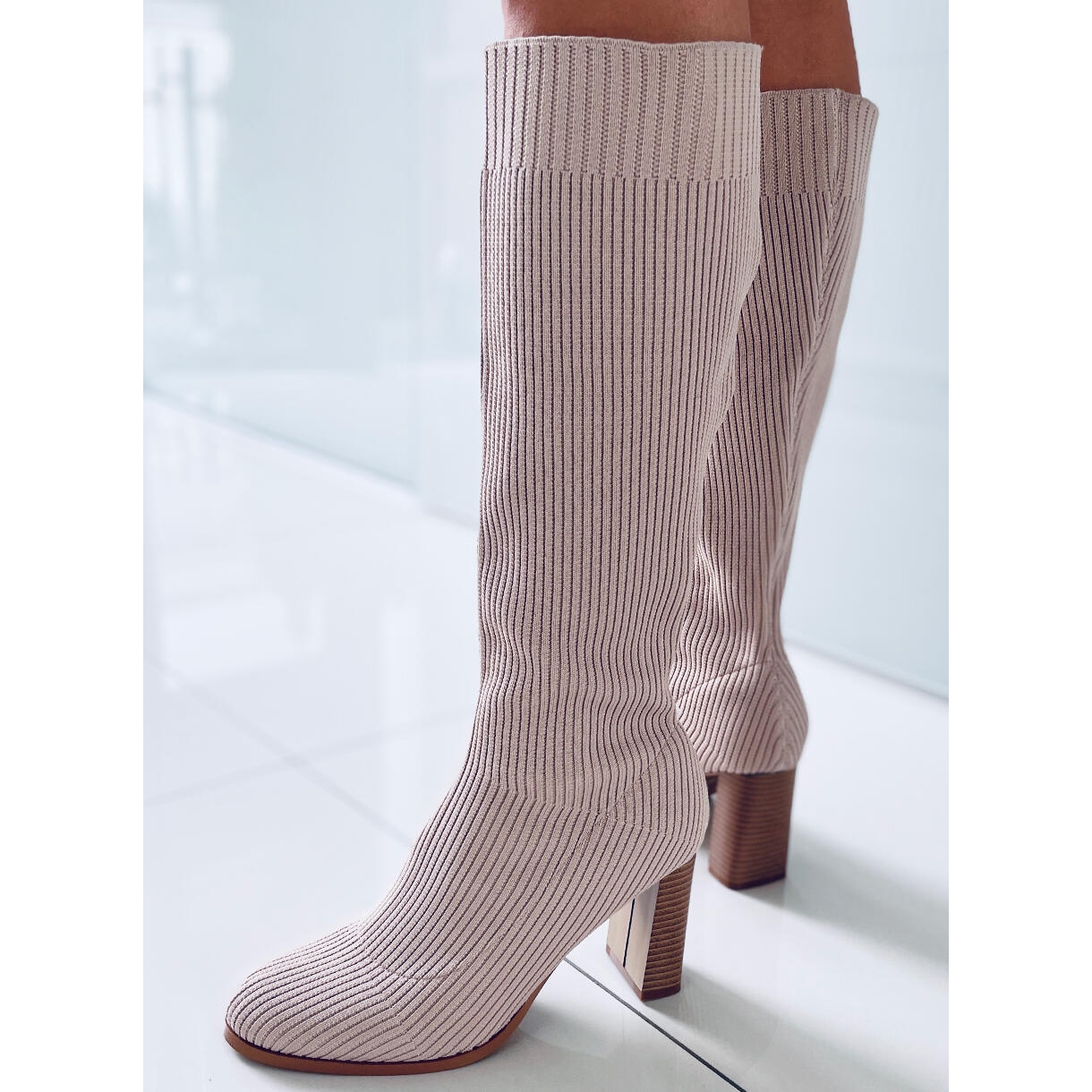 Vi presenterar eleganta Claudia högklackade sockboots i en nyans av taupe beige - perfekt för kvinnor som värdesätter en kombination av stil och komfort. Dessa klassiska stövlar kännetecknas av en välformad, rund tå och en stabil 8 cm hög klack, som tillför chic till varje styling.