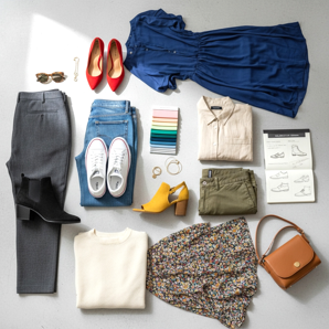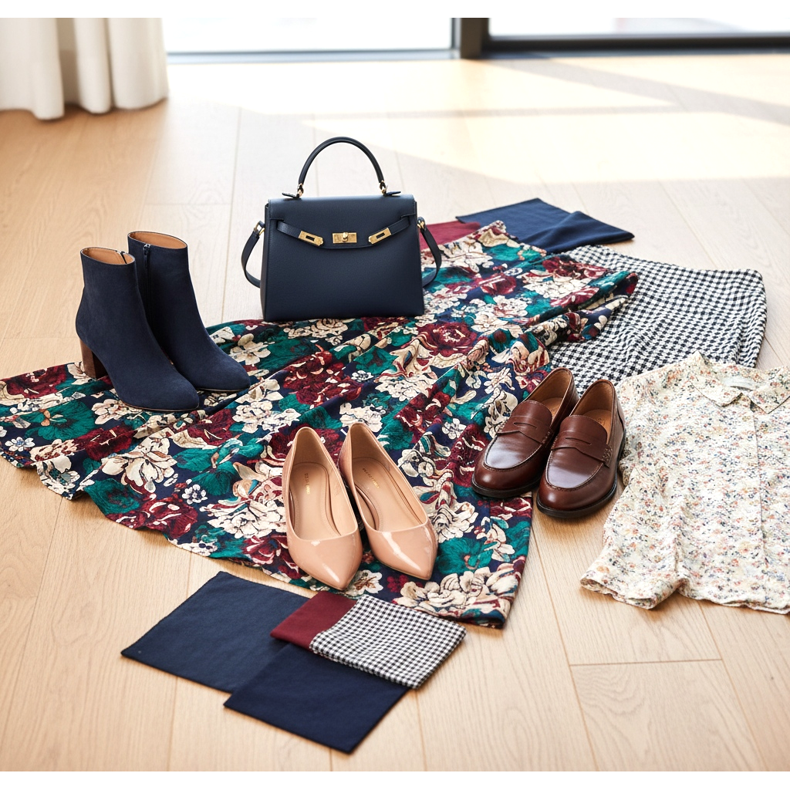 60-30-10-regeln hjälper dig att balansera färgerna i din styling. 60 % av outfiten ska vara den dominerande färgen (t.ex. klänning), 30 % sekundärfärgen (t.ex. handväska, kappa) och 10 % accentfärgen (t.ex. skor, smycken). Skor som accent kan vara uttrycksfulla utan att överväldiga helheten.