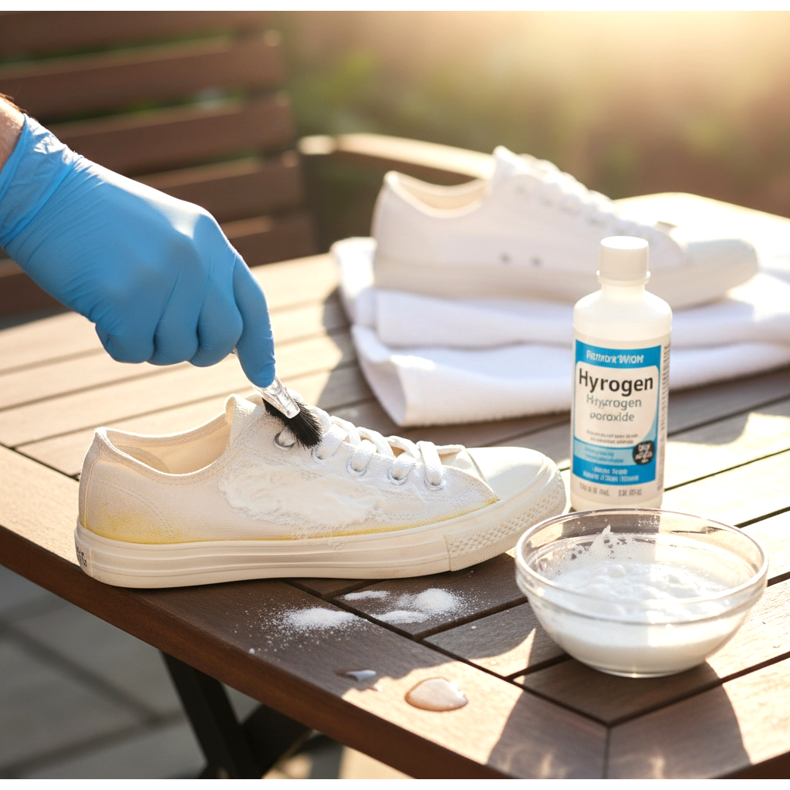 En av de bästa lösningarna för gulning är en blandning av väteperoxid och bakpulver. Denna kombination har blekande egenskaper som tar bort missfärgningar utan att skada materialet. Applicera blandningen på det smutsiga området, låt det ligga i solen i 20-30 minuter (UV-strålning aktiverar blekningsegenskaperna) och skölj sedan noggrant med vatten. Denna metod fungerar bäst på syntetmaterial och canvasmaterial.