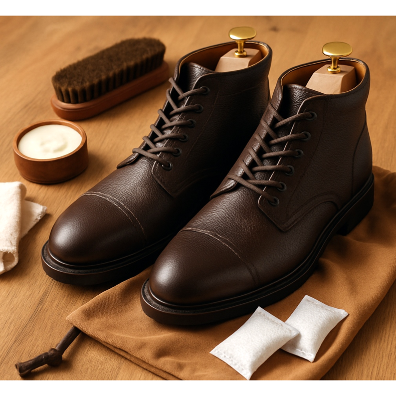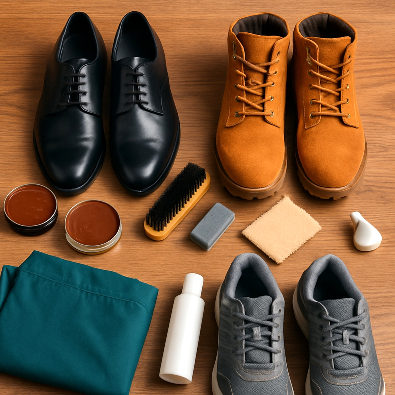 Köp: skokräm, impregneringsmedel, borstar (för slätt läder och mocka), träskoträd, skodeodorant, tidning för torkning.