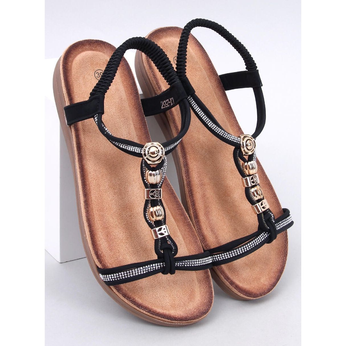 Möt sandalerna dekorerade med Isabey Black Zircons - det perfekta valet för kvinnor som vill kombinera elegans med komfort varje dag. Dessa svarta sandaler på en tjock sula kännetecknas av en unik stil, tack vare gyllene detaljer och glänsande zirkoner som ger dem en unik glöd. Detta är ett utmärkt alternativ för dem som inte vill oroa sig för tillbehör, eftersom dessa sandaler är en uttrycksfull dekoration i sig själva!