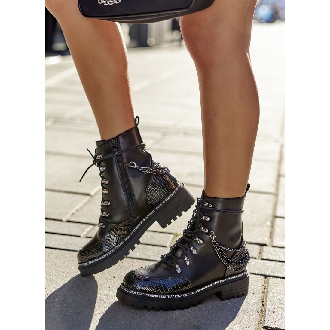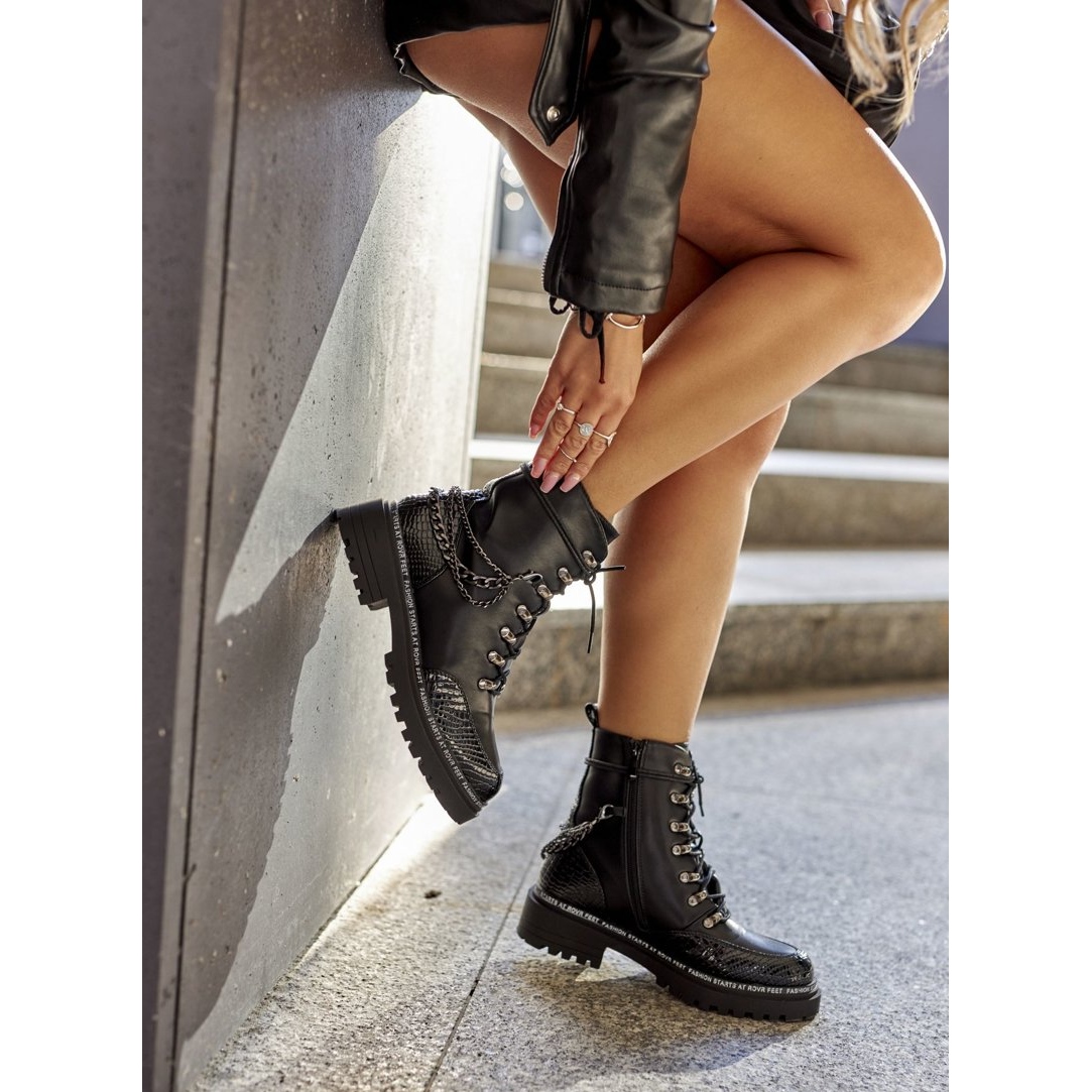Snygga, praktiska kvinnorsarbetare tillverkade av ekologiskt läder, som kombinerar en rå, urban look med komfort. Interiören isolerad med en mjuk skorfilt ger komfort och värme på svalare dagar. Dekorerad med metallkedjor för en fashionabla accent, utrustade samtidigt med snörning och ett bekvämt sidoslås - lätt att sätta på och justera i form.