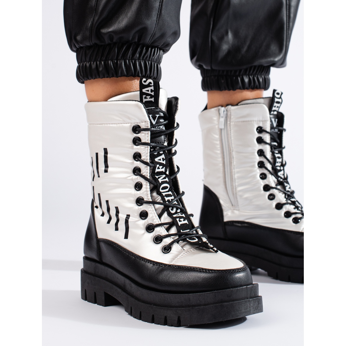 Moderna Vincez -arbetare är en kombination av urban casual med praktisk uppvärmning - perfekt för svalare dagar. Tillverkad av ekologiskt läder med en mjuk, textilinredning och en pälsinsats ger de en trevlig värme utan att ge upp ett fashionabelt utseende. En stabil plattform och en massiv sula med en slitbanan lägger till karaktär och garanti grepp.