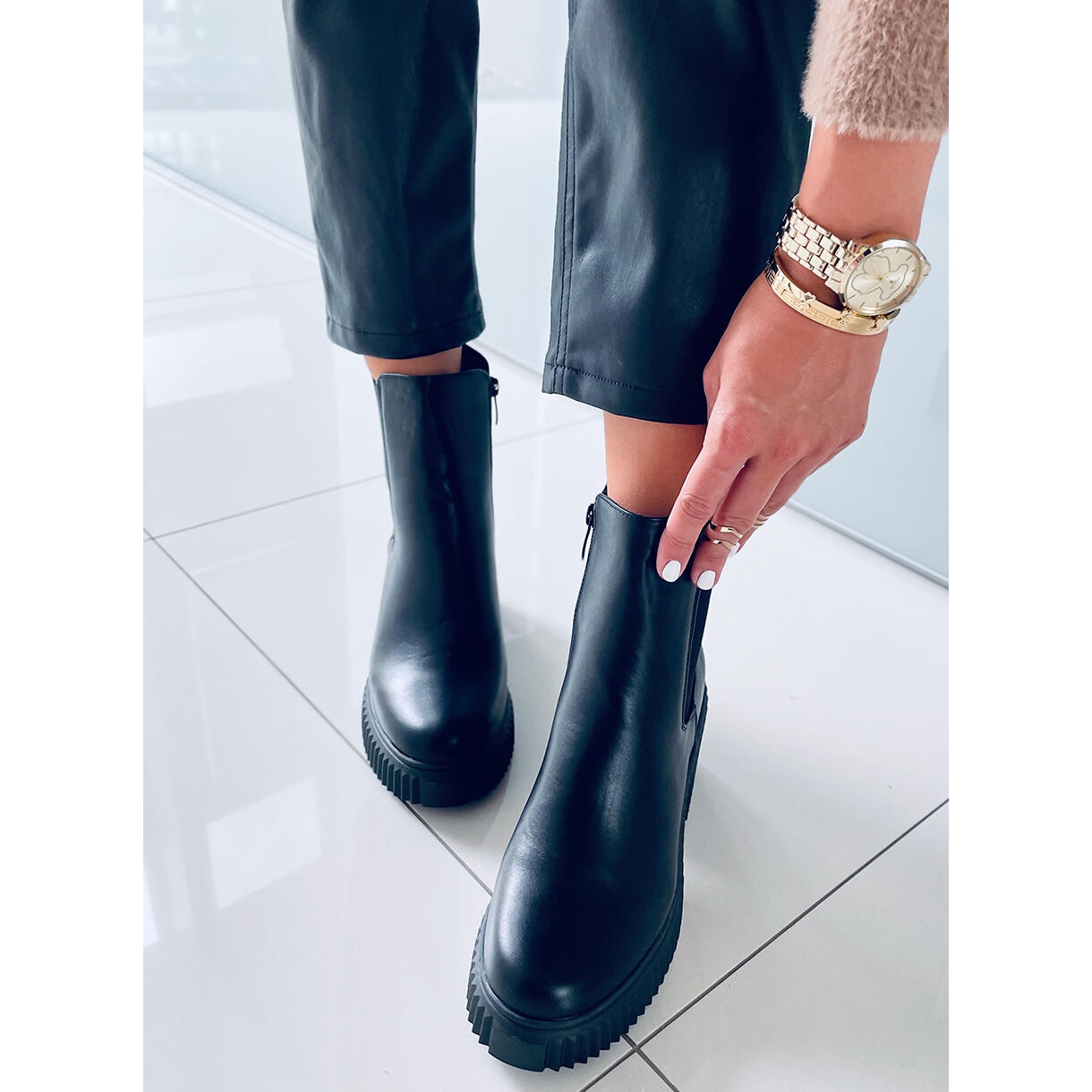 Lär känna Janet Black Chelsea boots - den perfekta kombinationen av mode och komfort! Dessa svarta ankelstövlar för kvinnor på en 2,5 cm hög plattform är ett måste i varje kvinnas garderob. Deras designer 8 cm höga klack gör dem till ett riktigt statement som väcker uppmärksamhet.