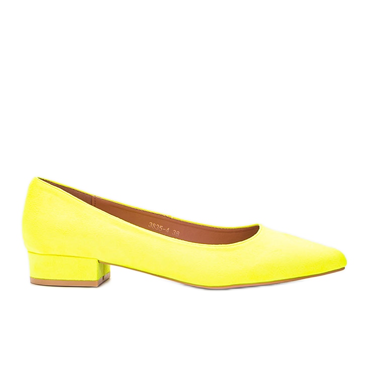 Dessa pumpar finns i storlekar från 36 till 41, vilket möjliggör en perfekt passform till vilken figur som helst. Den beige plastsulan matchar perfekt den gula färgen på skorna, vilket framhäver dess moderna design.