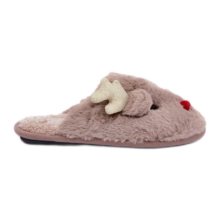 Detaljer: Jultofflor med renmotiv, lurviga, mörkbeige