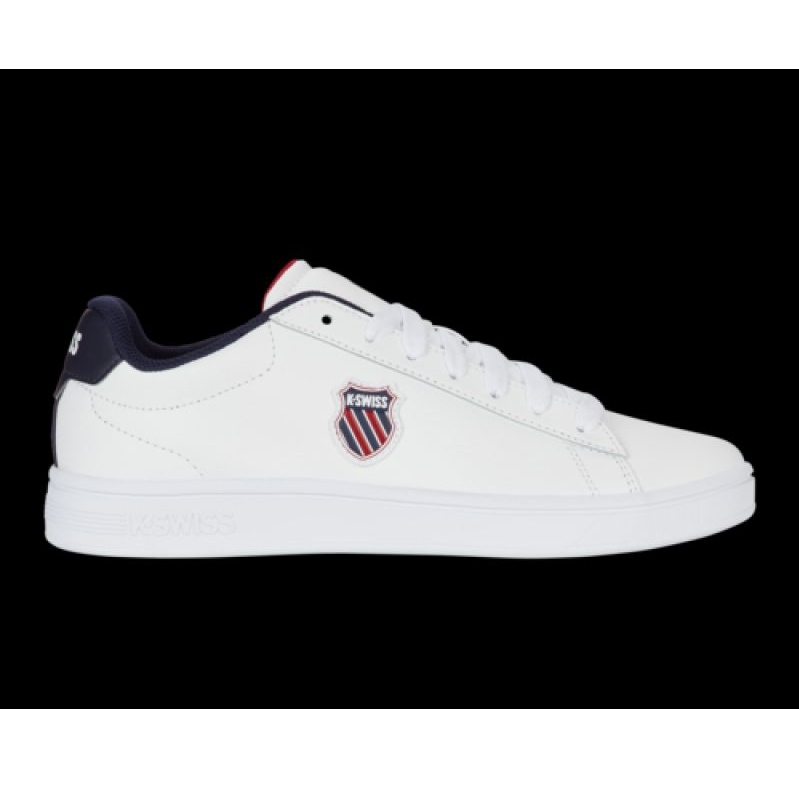 Upptäck den nya dimensionen av komfort och stil med manliga sneakers K-Swiss Court Shield II i vitt med peacoat och samba röda accenter. Modell 04412-983-M kombinerar modern design och funktionalitet, idealiskt lämpad för vardagliga situationer och under sportaktiviteter.