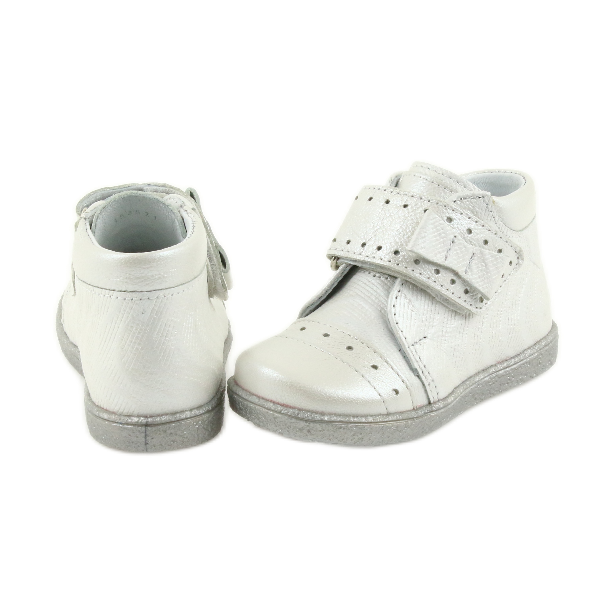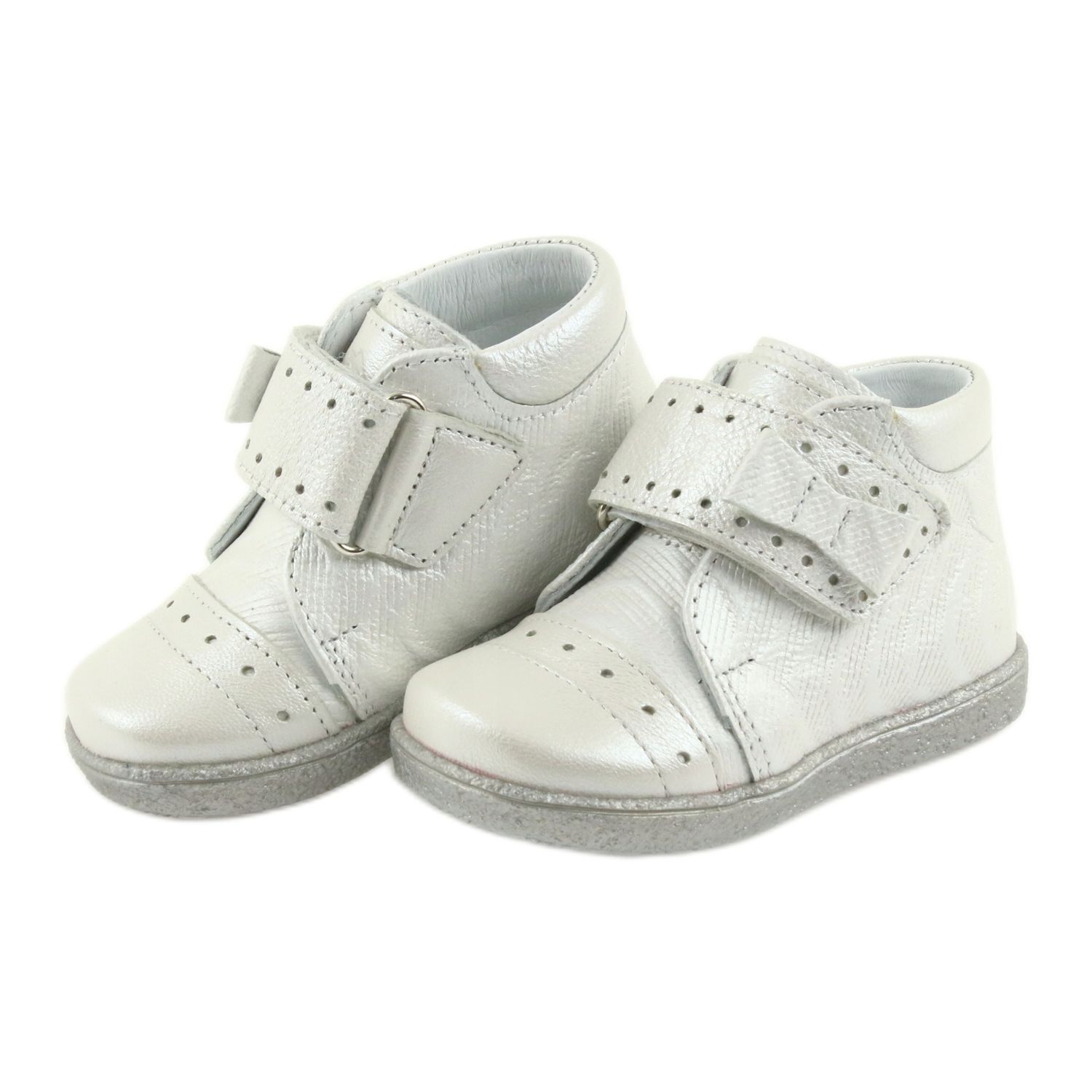 Ren Men 1535 - Silverflickor med en dekorativ båge som kombinerar elegans med vardagens komfort. Tack vare den metalliska finishen och subtila bågen kommer skor att vara bra både dagligen och för speciella tillfällen. En solid, styv stabilisering stabiliserar foten och skyddar vristen, och ett bekvämt kardborrfäste gör det möjligt för föräldern att snabbt ta på sig och lära barnets oberoende.