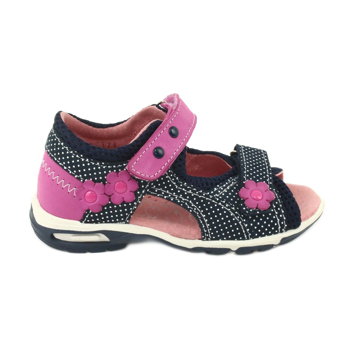 Dessa charmiga sandaler finns i två färger: marinblå och rosa, dekorerade med små vita prickar och dekorationer i form av rosa blommor. Tack vare kardborreknäppningen kan de enkelt anpassas till barnets fot, vilket ökar användarkomforten. Den styva hälen ger tillräcklig stabilisering, och den profilerade innersulan gör att sandalerna passar perfekt till fotens anatomi.