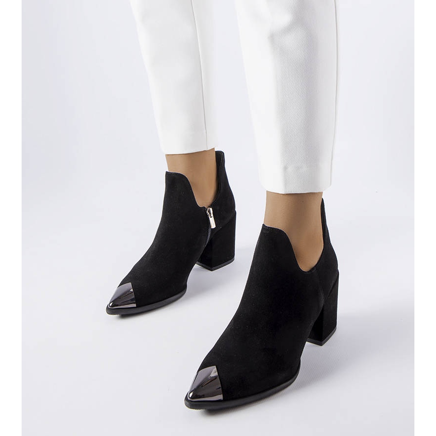 Svart läder Karino -stövlar - snygga, bekväma och redo för vardagliga utmaningar. Tillverkad av naturligt mocka läder räcker de efter fotled och presenterar en elegant cowboy -snitt med en modern spetsig näsa dekorerad med en silvermetallinsats. Den låghel -typhälen med en höjd av 7 cm säkerställer stabilitet och feminin silhuett, och blixtlåset på insidan gör det lättare att ta på sig.