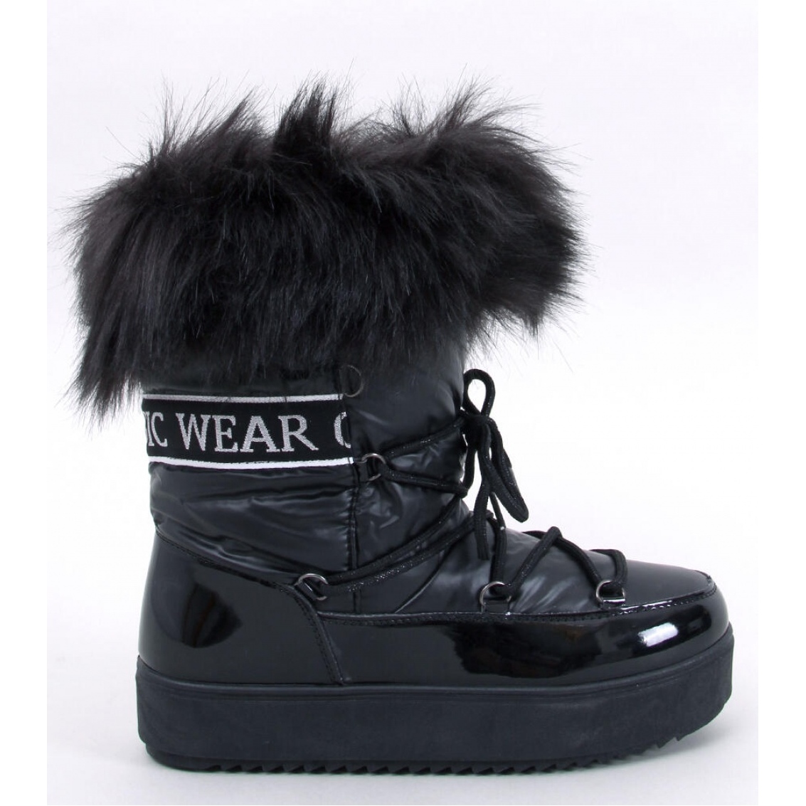 Tillverkade av ekologiskt lackerat läder- och ortalionstyg, dessa snöstövlar kombinerar estetik med funktionalitet. Ytterligare isolering i form av tjock päls gör att fötterna förblir varma och skyddade från kylan och tillför samtidigt karaktär till dem. Black gör modellen universell och matchar många vinterstyliseringar.