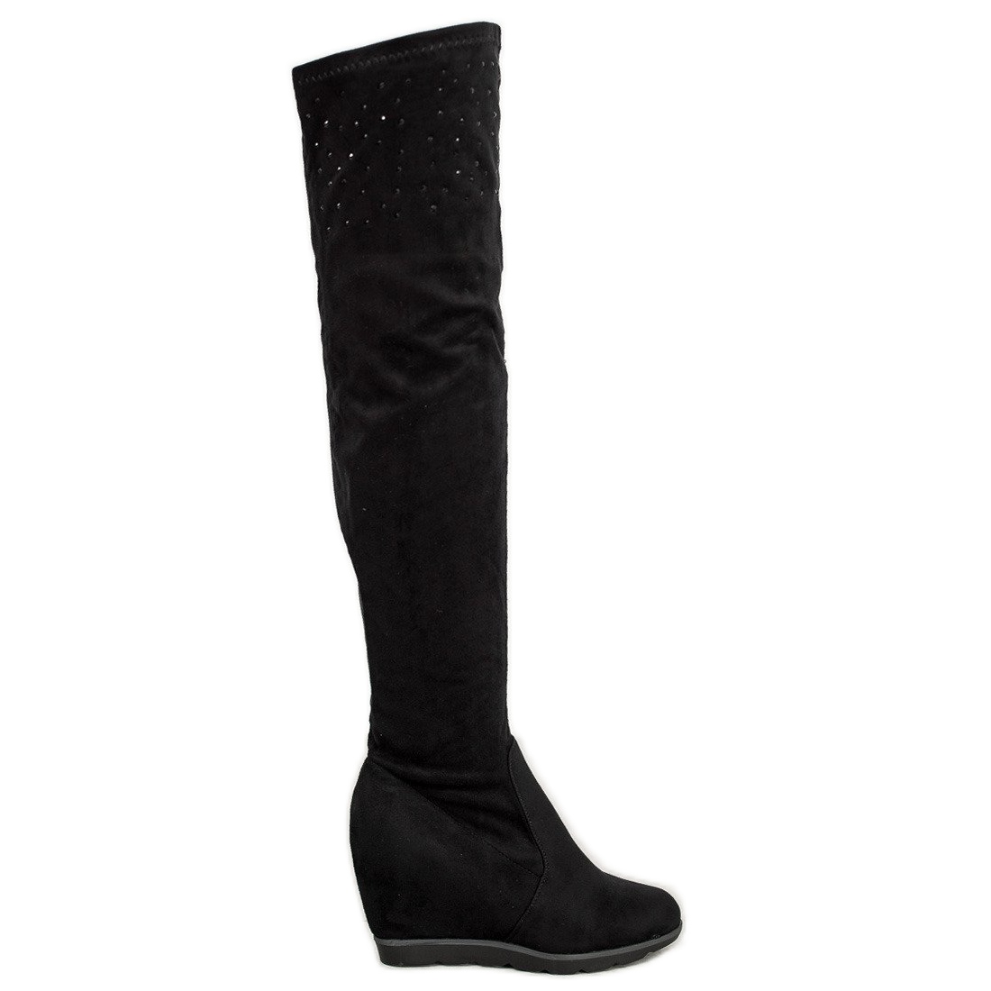 Upptäck elegans och komfort med en wedge boot från märket SHELOVET. Dessa extremt fashionabla stövlar i en tidlös svart färg är gjorda av högkvalitativt ekologiskt mockaläder, vilket gör att de ser extremt snygga och lyxiga ut. Ovandeln ovanför knäet, dekorerad med subtila, glänsande strass, ger dem en unik karaktär, vilket gör dem till ett perfekt komplement till varje kvällsstyling.