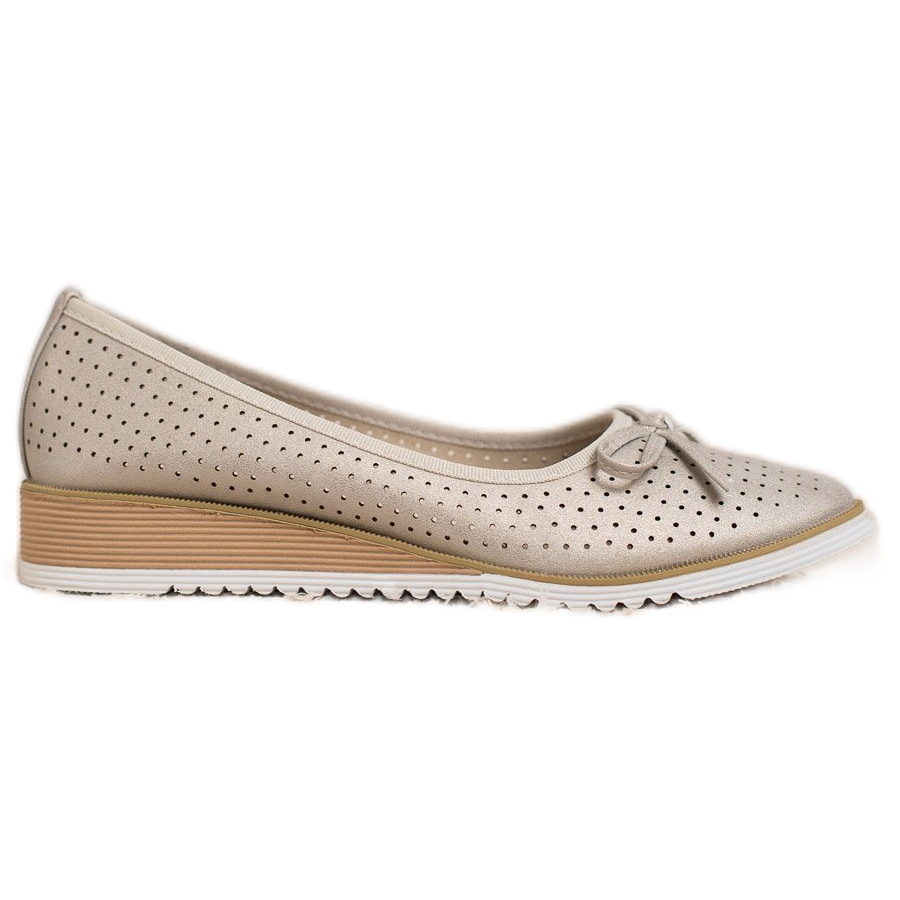 Dessa är unika genombrutna kilpumpar från det välkända varumärket Goodin, som njuter av sin eleganta gyllene färg. Dessa skor är det perfekta valet för en kvinna som värdesätter både stil och komfort. Det fashionabla genombrutna mönstret och den charmiga rosetten tillför subtil femininitet till dem, vilket gör att de ser bra ut på fötterna.