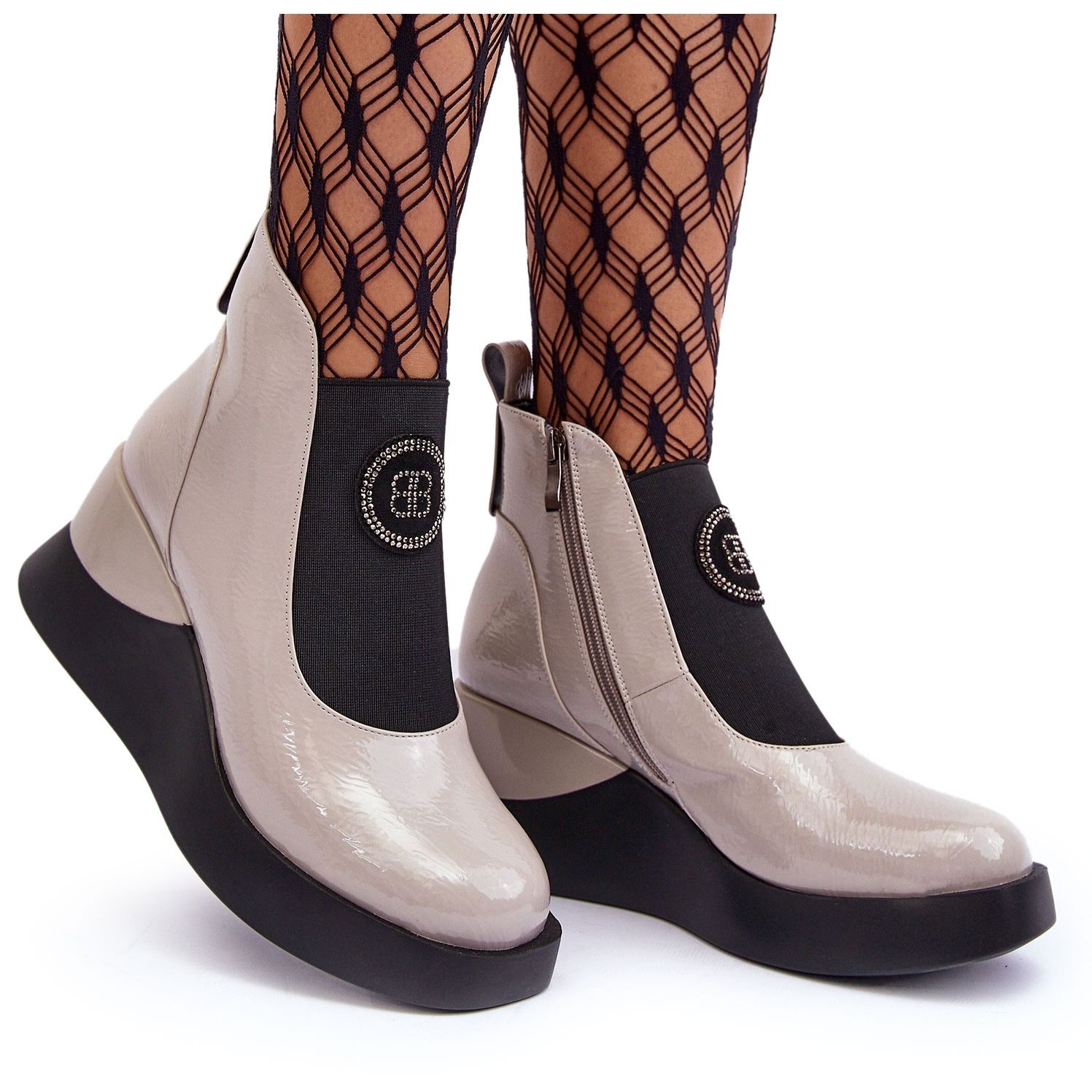 Eleganta och bekväma kvinnors stövlar S. Barski, perfekt för höstens säsong. Modellen satt på en stabil kil med en höjd av 7 cm med en subtil plattform, tack vare vilken den lägger till centimeter och inte ger upp komforten att gå. Tillverkad av lackerat ekologiskt läder i en nyans av L. grå med svarta accenter - ett modernt, universellt utseende som matchar många stilar.