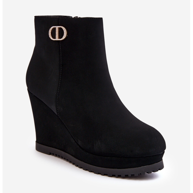 Eleganta, svarta ankelstövlar från WJ2, monterade på en stabil kil och plattform. Modellen kombinerar komforten att bära med en subtil, glänsande dekoration på den övre, tack vare vilken den kommer att fungera både varje dag och för mer eleganta uppsättningar under hösten/vintersäsongen.