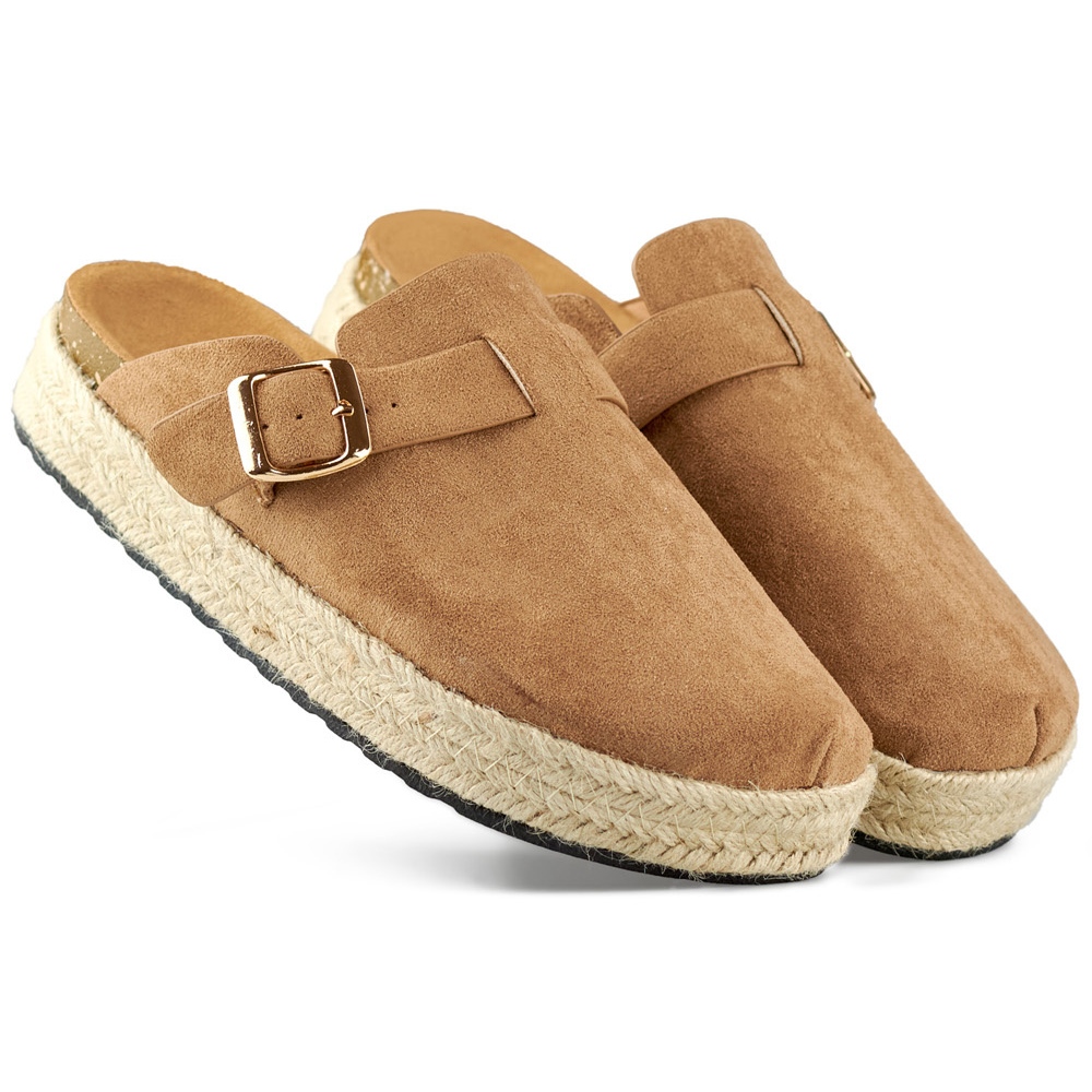 Information: Klädda espadrillor för kvinnor med spänne, ljusbruna