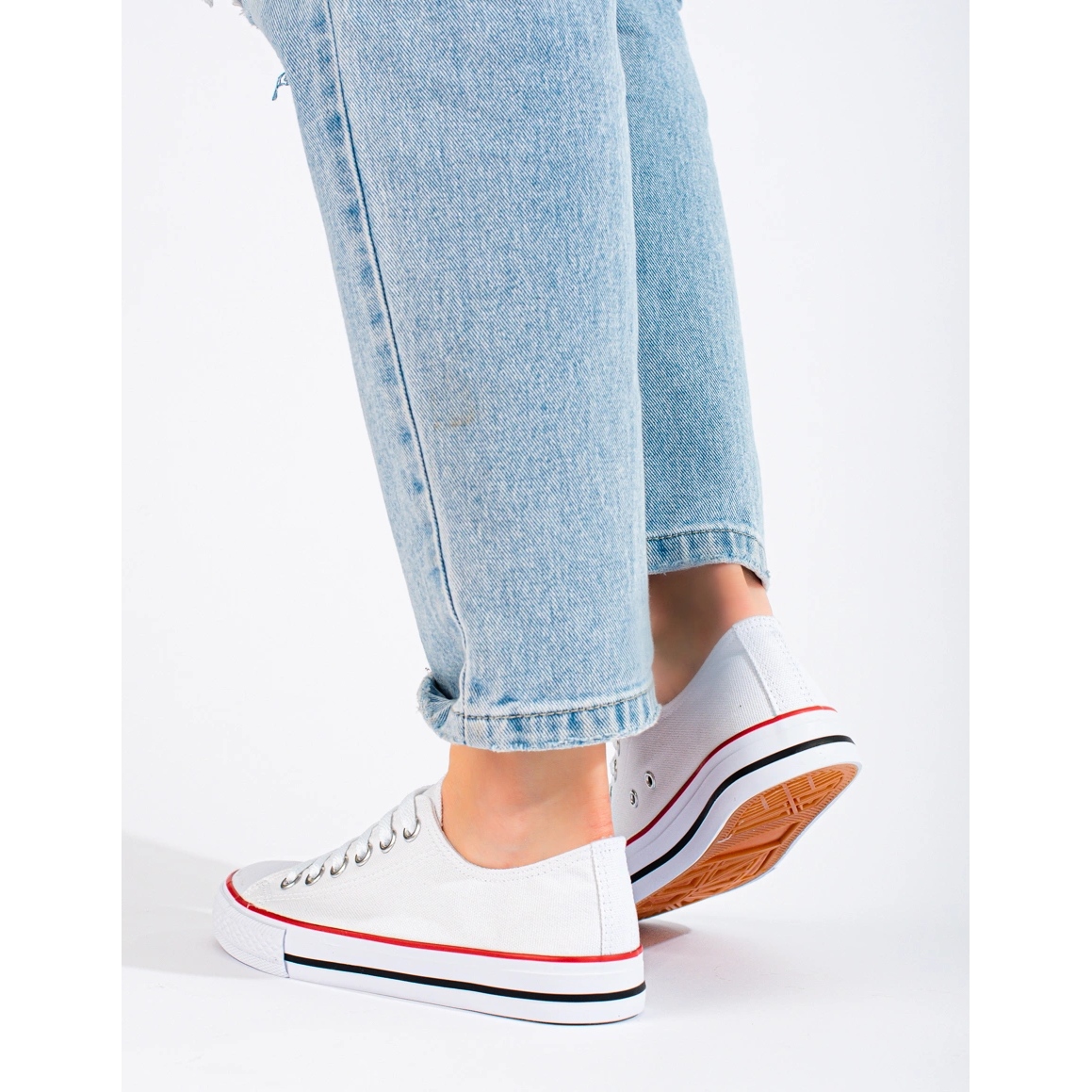 Universella, vita kvinnors sneakers i ett klassiskt snitt - perfekt varje dag. Tillverkad helt av tyg, med en textilinsula och en mjuk, byggd -up foder för komfort. Spets -up, låg, med en gummisula med en slitbanan, kombinerar en sportig karaktär med avslappnad elegans.