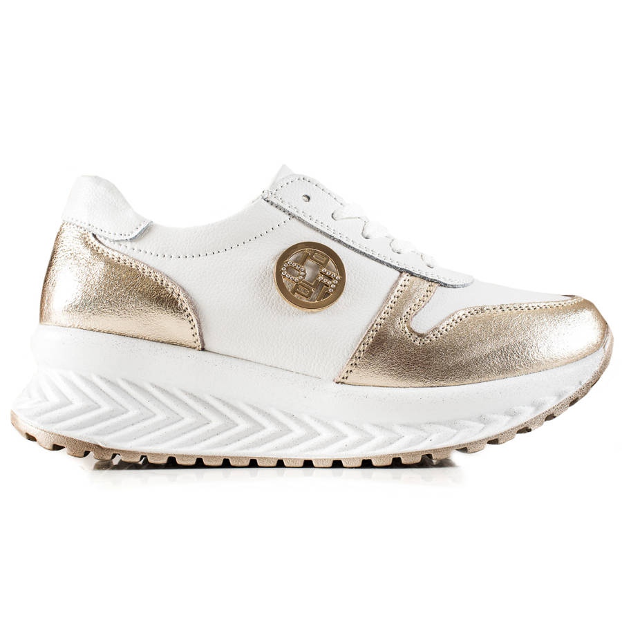 Vi presenterar klassiska lädersneakers från märket Filippo, som är den perfekta kombinationen av komfort och stil. Dessa eleganta damskor i vitt med iögonfallande guldaccenter är ett utmärkt val för dagligt bruk. Tack vare den mjuka, inbyggda hälen och den runda tån är det ett rent nöje att bära dem.