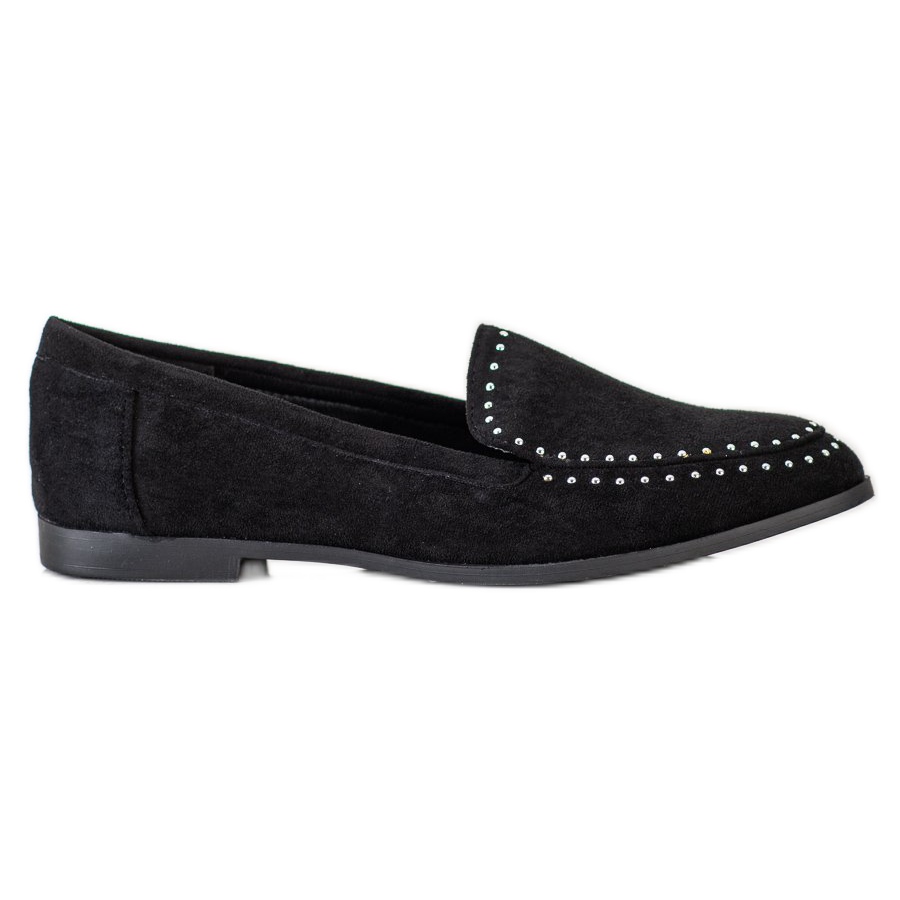 Tillverkade av högkvalitativ mockaimitation, dessa herrar ser extremt chica ut, och deras svarta färg gör att de matchar många stilar. Häldisken är stängd och mjuk, vilket gör den bekväm att bära hela dagen. En ytterligare fördel är silverdekorationer i form av strass, som ger skorna en modern och elegant karaktär.