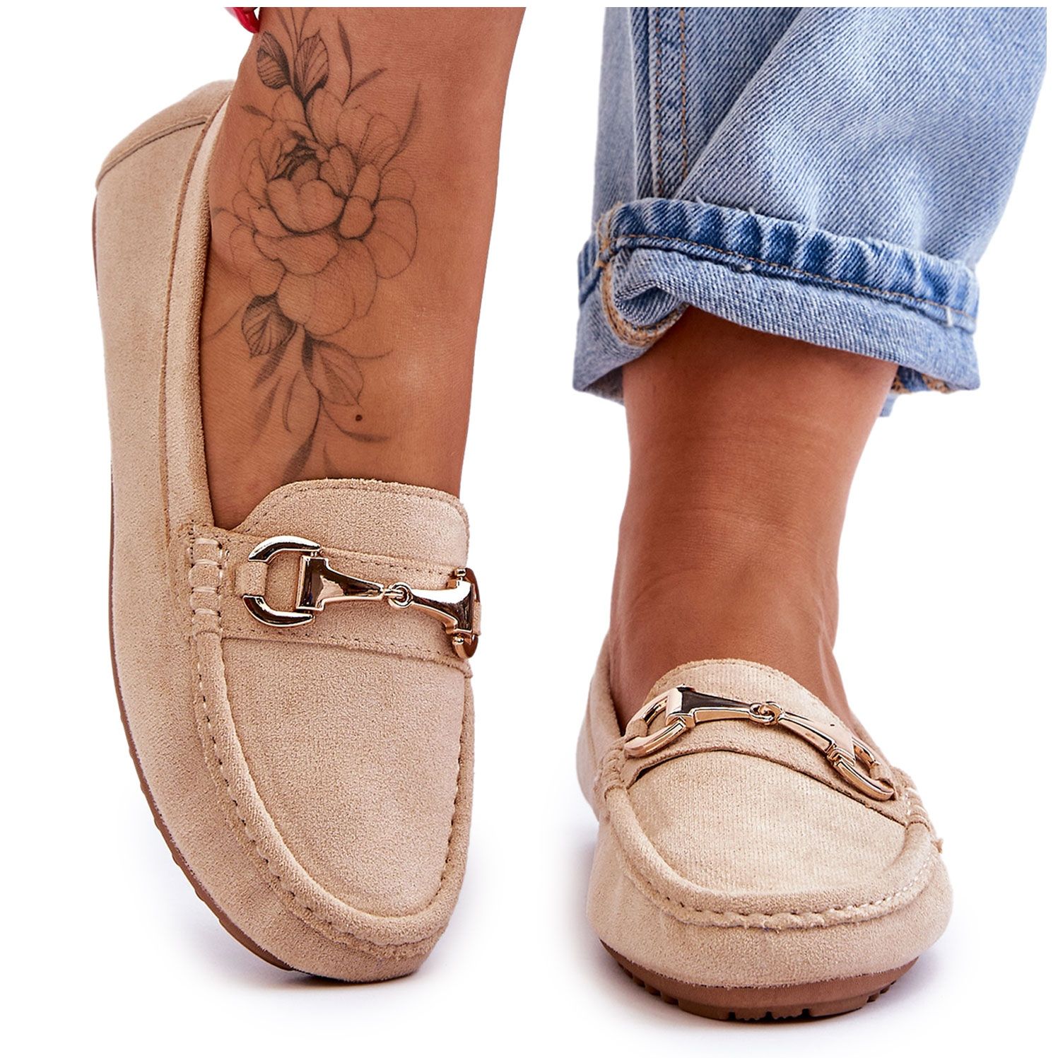 Klassiska beige Arla mockasiner med dekoration är dekorerade med ett karakteristiskt inslag på framsidan, vilket tillför elegans och sofistikering. Trots avsaknaden av en traditionell klack lyfter den delikata 1,5 cm höga plattformen figuren subtilt och säkerställer bekväm gång på alla underlag.