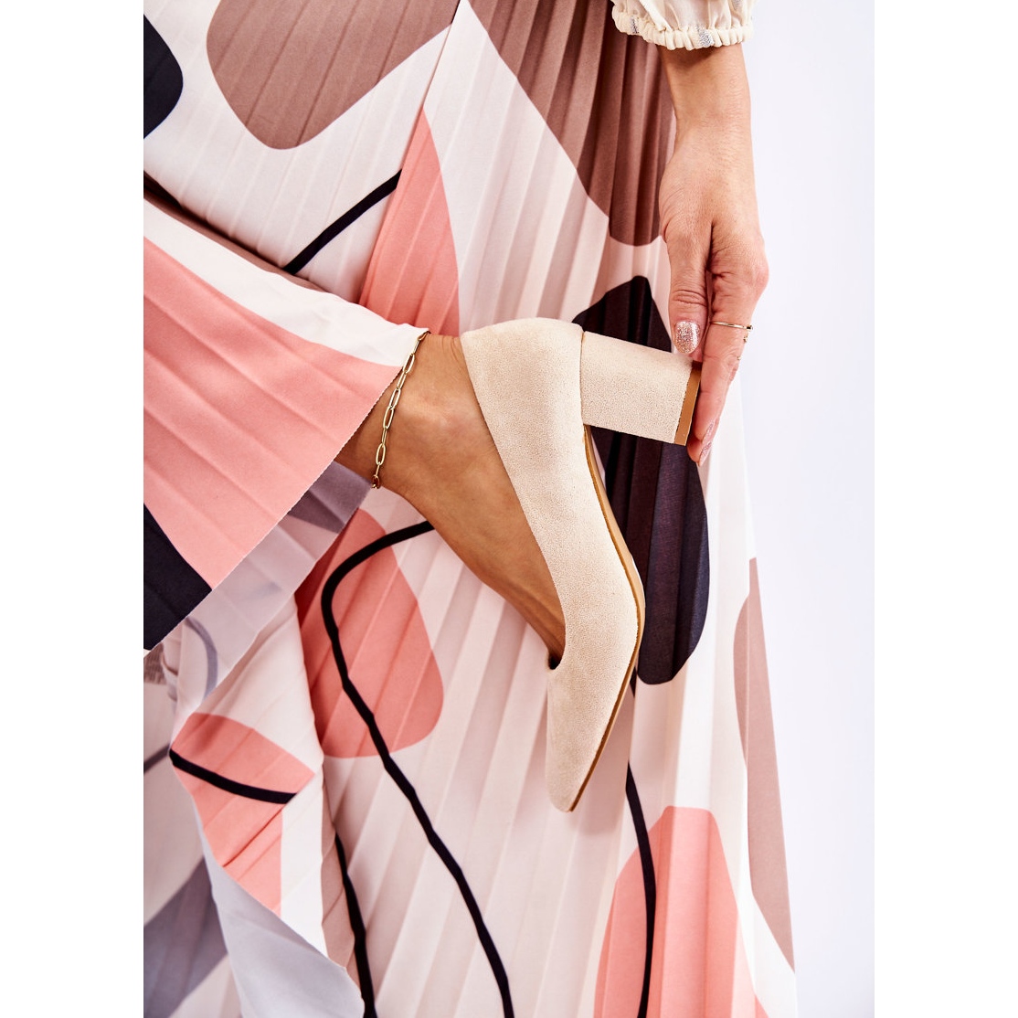 Upptäck elegans och klassisk stil med högklackade pumps i beige mocka från märket PS1! Dessa unika skor kombinerar stil och komfort, vilket gör dem perfekta för alla situationer. Tillverkade av högkvalitativ eko-mocka, pumparna kännetecknas av en stabil, 6 cm hög blockklack, vilket säkerställer den perfekta kombinationen av klassisk stil och komfort.