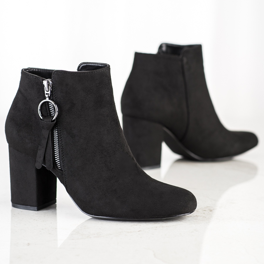 Stövlarna är gjorda av högkvalitativt ekologiskt mockaläder och utmärks av en djupsvart färg, som är extremt universell. Häldisken är stängd och förstyvad, vilket ger tillräckligt stöd för fotleden. Klackhöjden är 7,5 cm, vilket ger klass och slimmar figuren, och samtidigt garanterar bärkomfort tack vare den stabila stolpen.